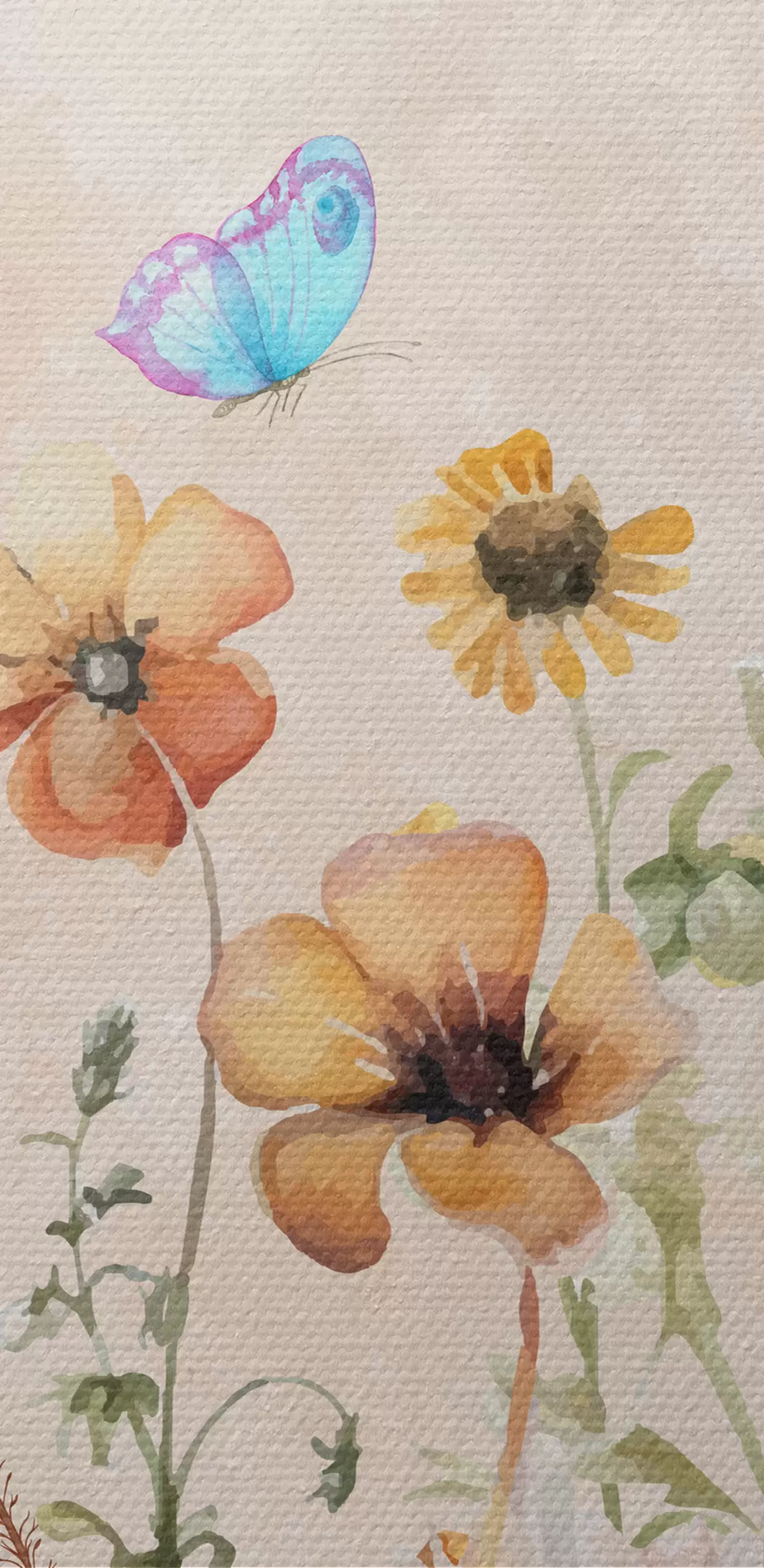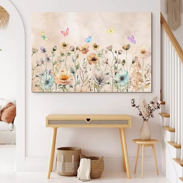 Schilderij wilde bloemen met aquarellen, heldere vlinders, pastelkleuren Art. s38441