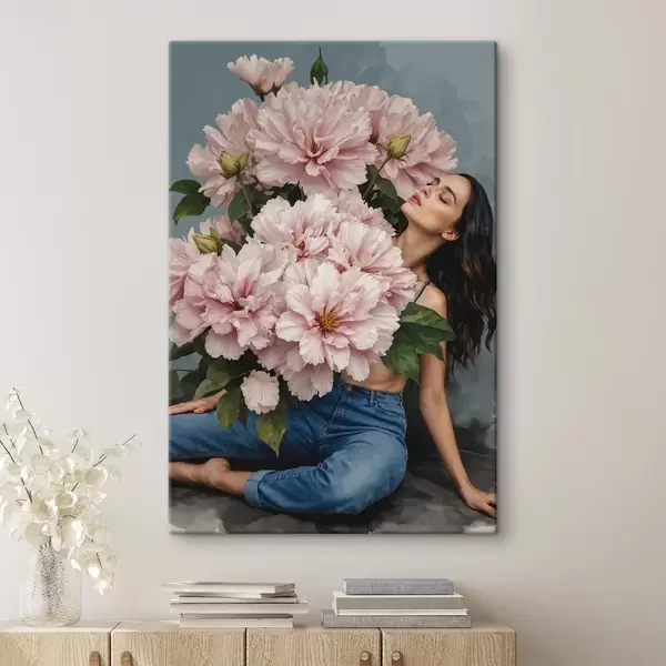 Schilderijen Een vrouw op de grond met een groot boeket bloemen s38595