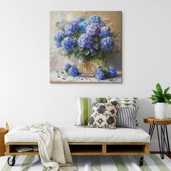 Schilderij Blauwe hortensia's op tafel Art. s38709