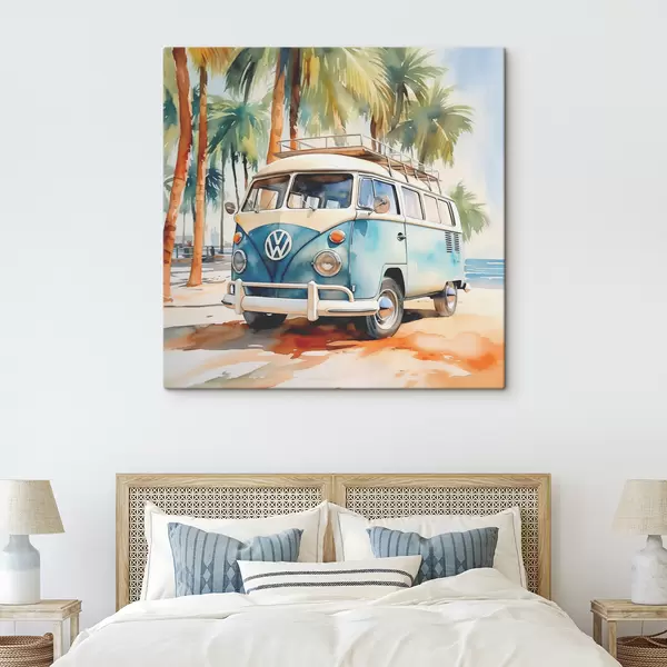 Schilderij Een reisauto staat geparkeerd op het strand tegen een achtergrond van palmbomen aquarel Art. s38911