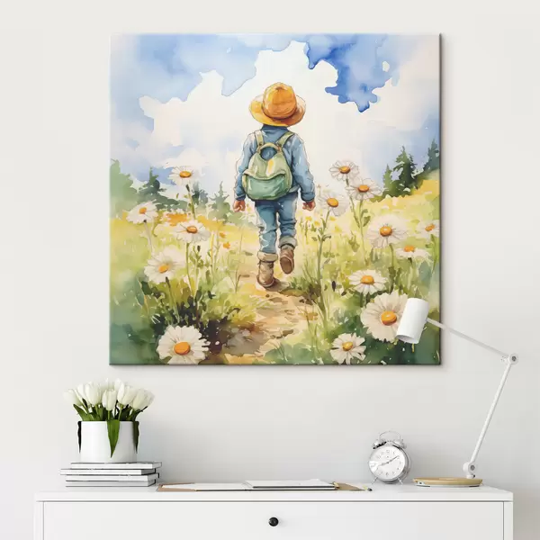 Schilderij Een jongen met een cowboyhoed met een groene rugzak achter zijn rug en een blauw pak loopt langs een pad in een kamilleveld, aquarel Art. s38946