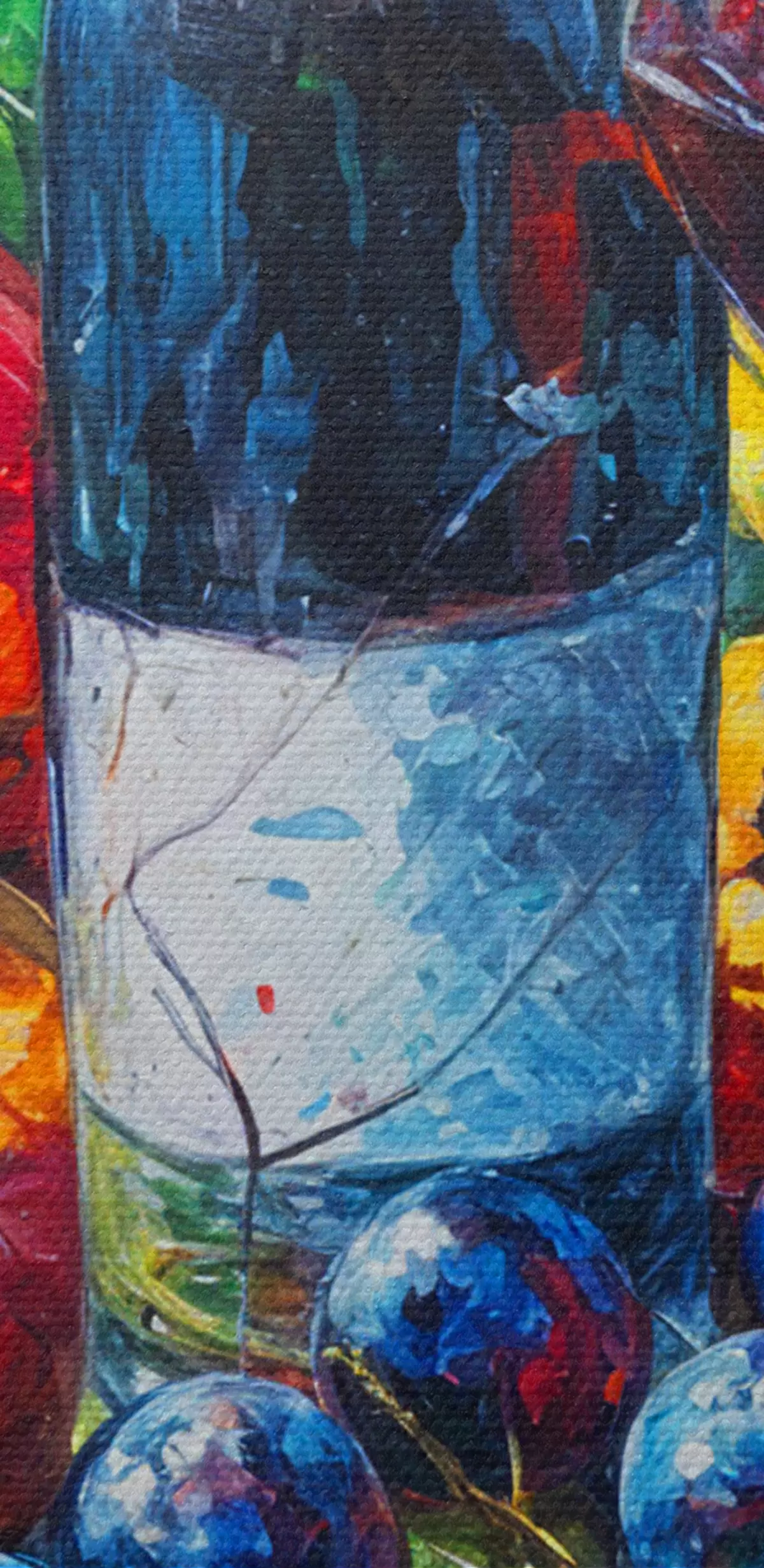 Schilderij Abstract stilleven van een fles wijn, een glas wijn en kleurrijk fruit met spatten van verschillende kleuren Art. s38958