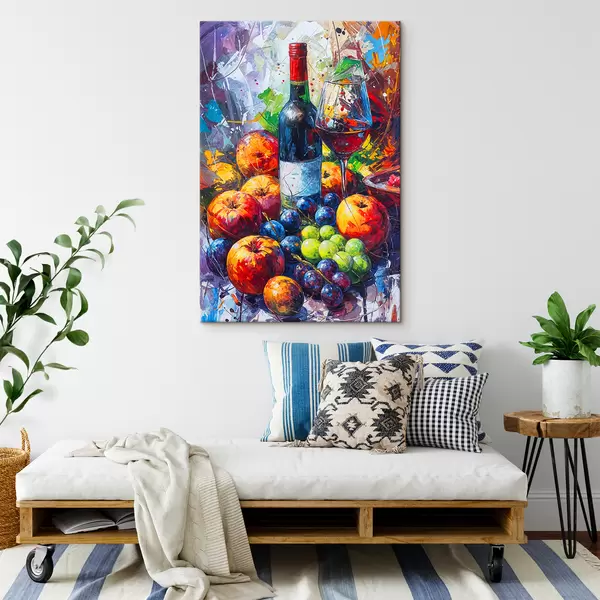 Schilderij Abstract stilleven van een fles wijn, een glas wijn en kleurrijk fruit met spatten van verschillende kleuren Art. s38958