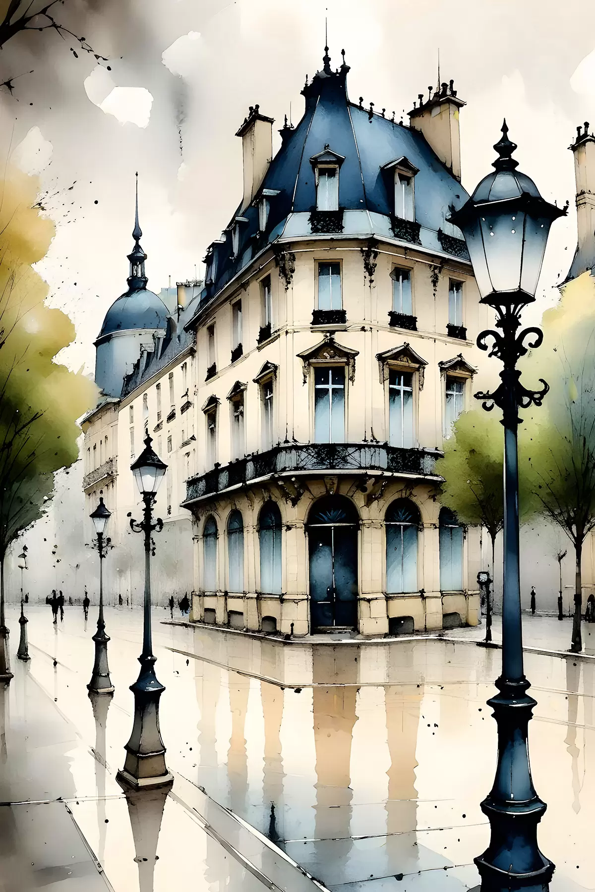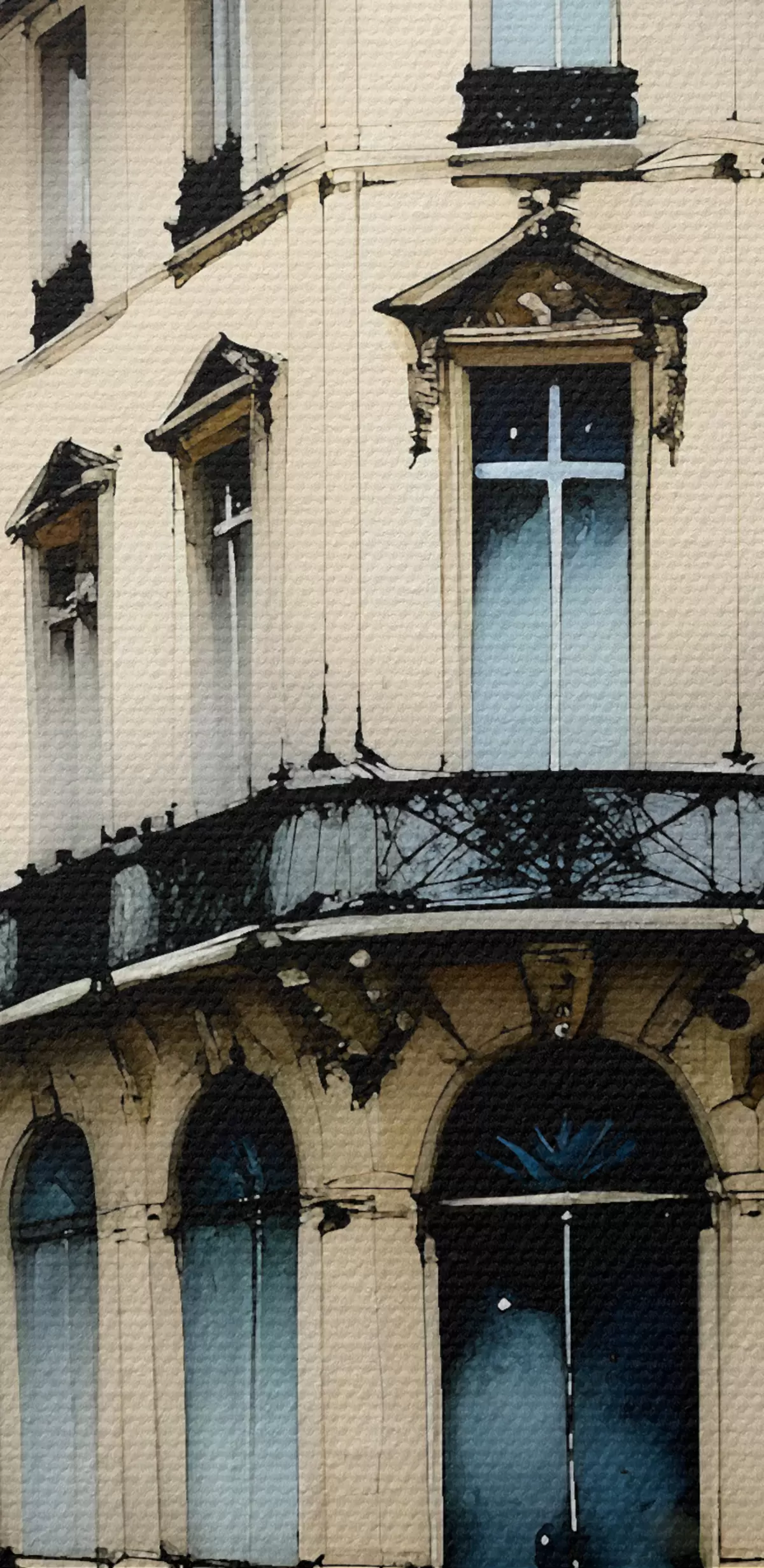 Schilderijen Waterverfschilderij van een historisch gebouw met een gebogen gevel en decoratieve architectonische elementen s38975