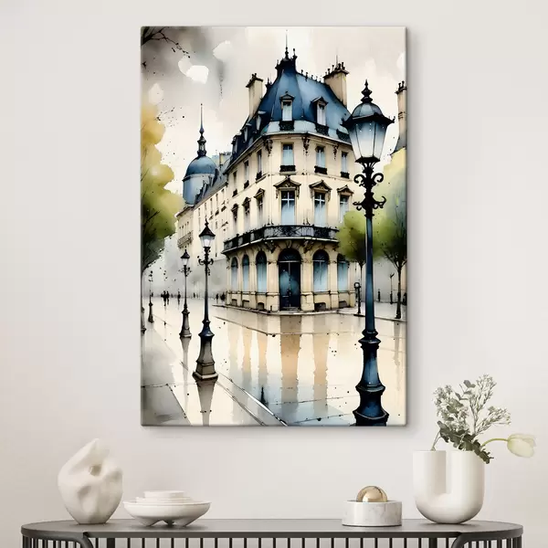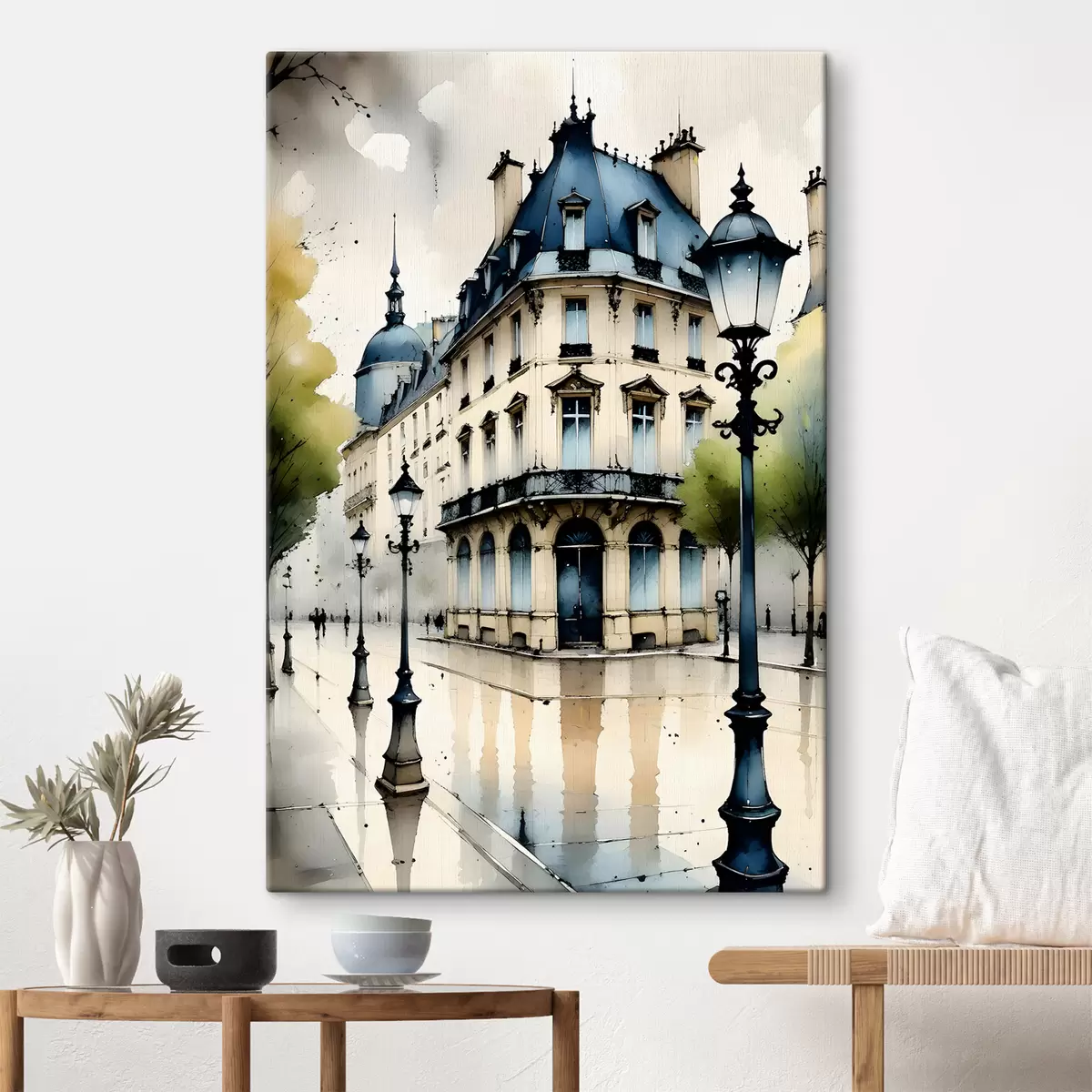 Schilderij Waterverfschilderij van een historisch gebouw met een gebogen gevel en decoratieve architectonische elementen Art. s38975