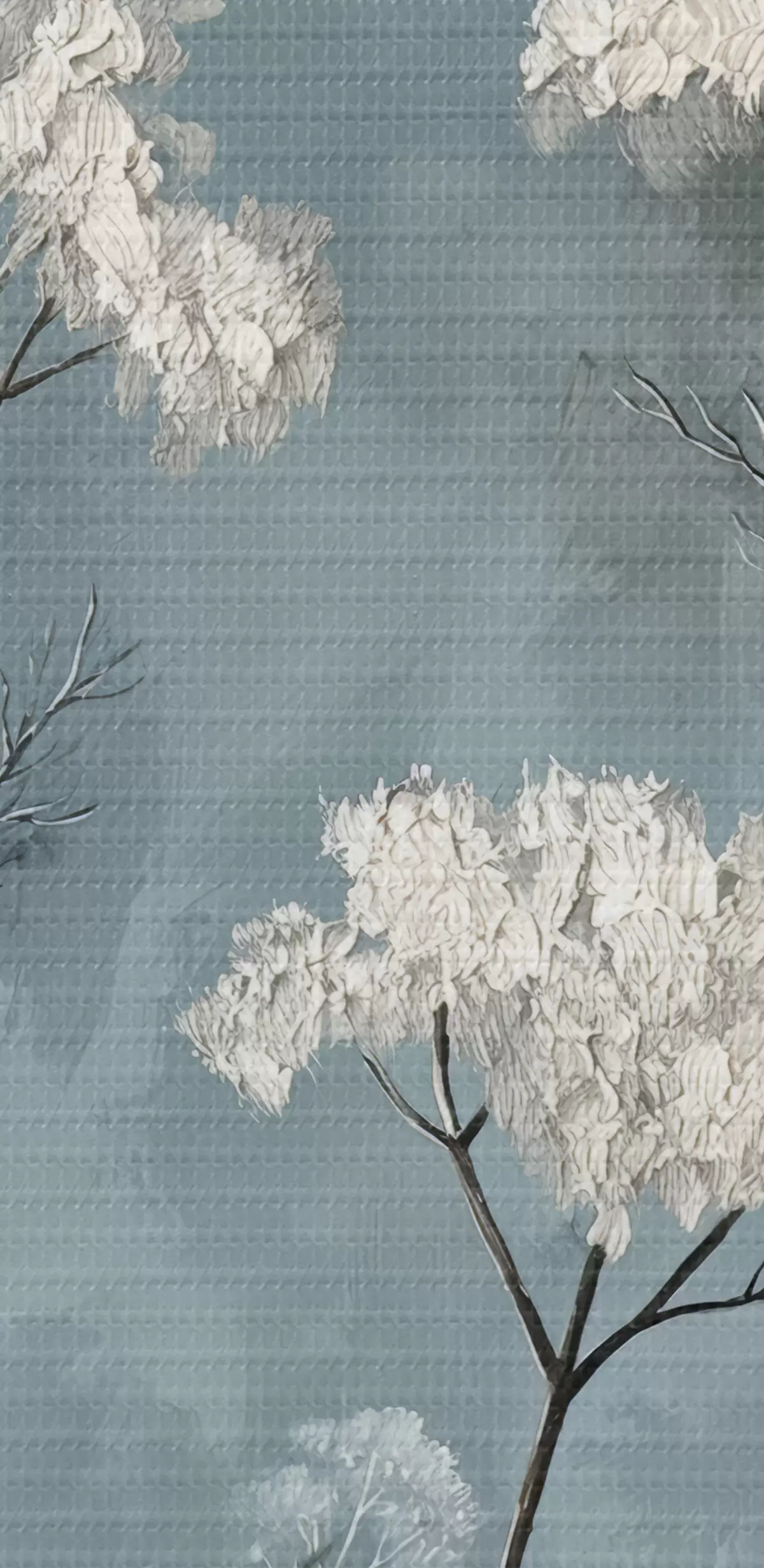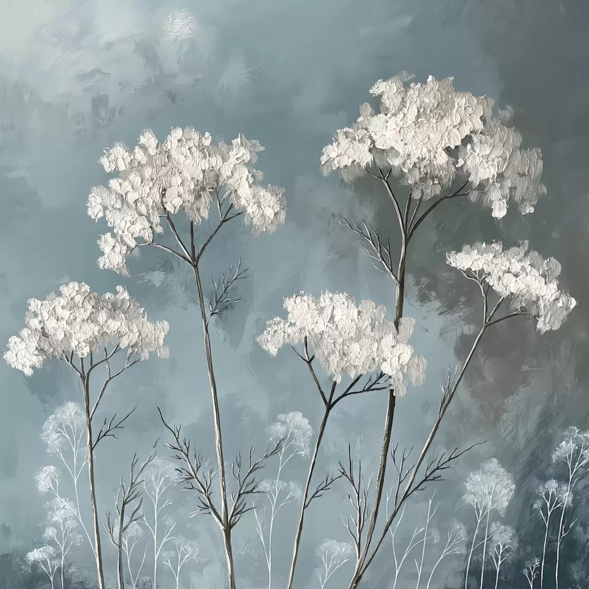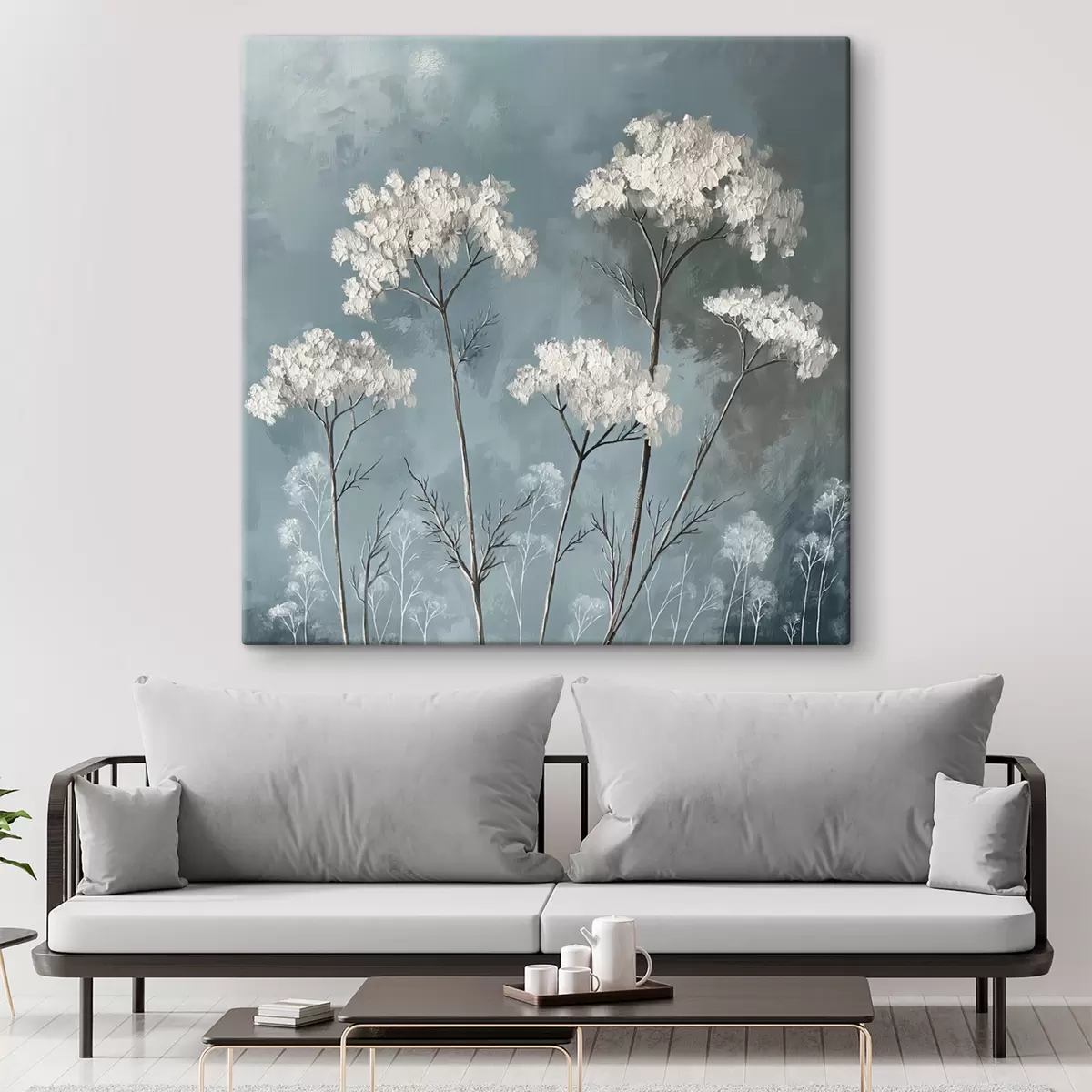 Schilderij olieverfschilderij van delicate witte bloemen op een blauwe achtergrond Art. s39325