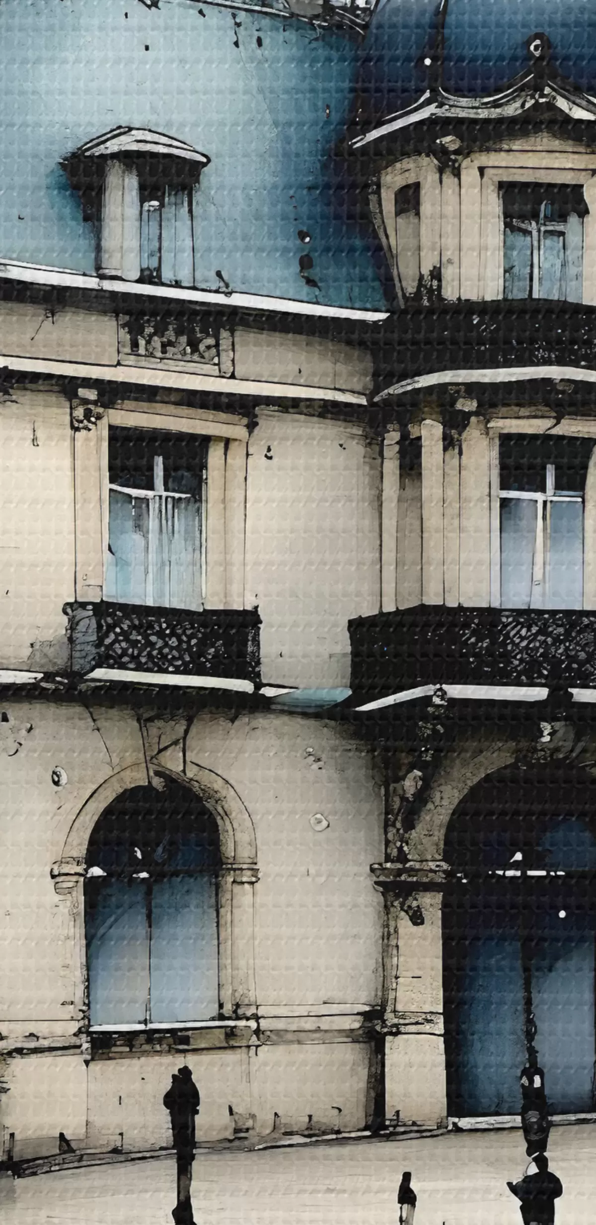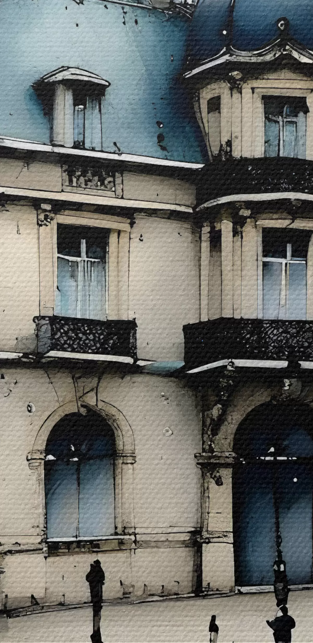 Schilderijen Een groots gebouw met aquarelkunst omringd door lantaarnpalen en bomen, op een regenachtige dag s39391