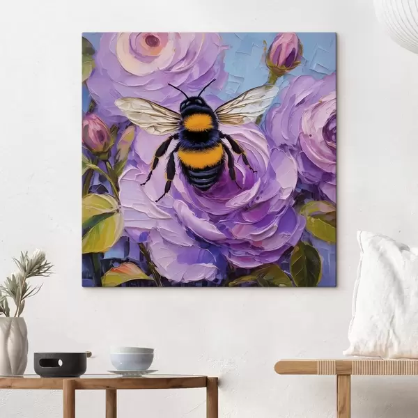 Schilderij Bij op de roze pioenrozen, kleurrijke zomerbloemen, olieverfschilderij, levendige penseelstreken Art. s39411