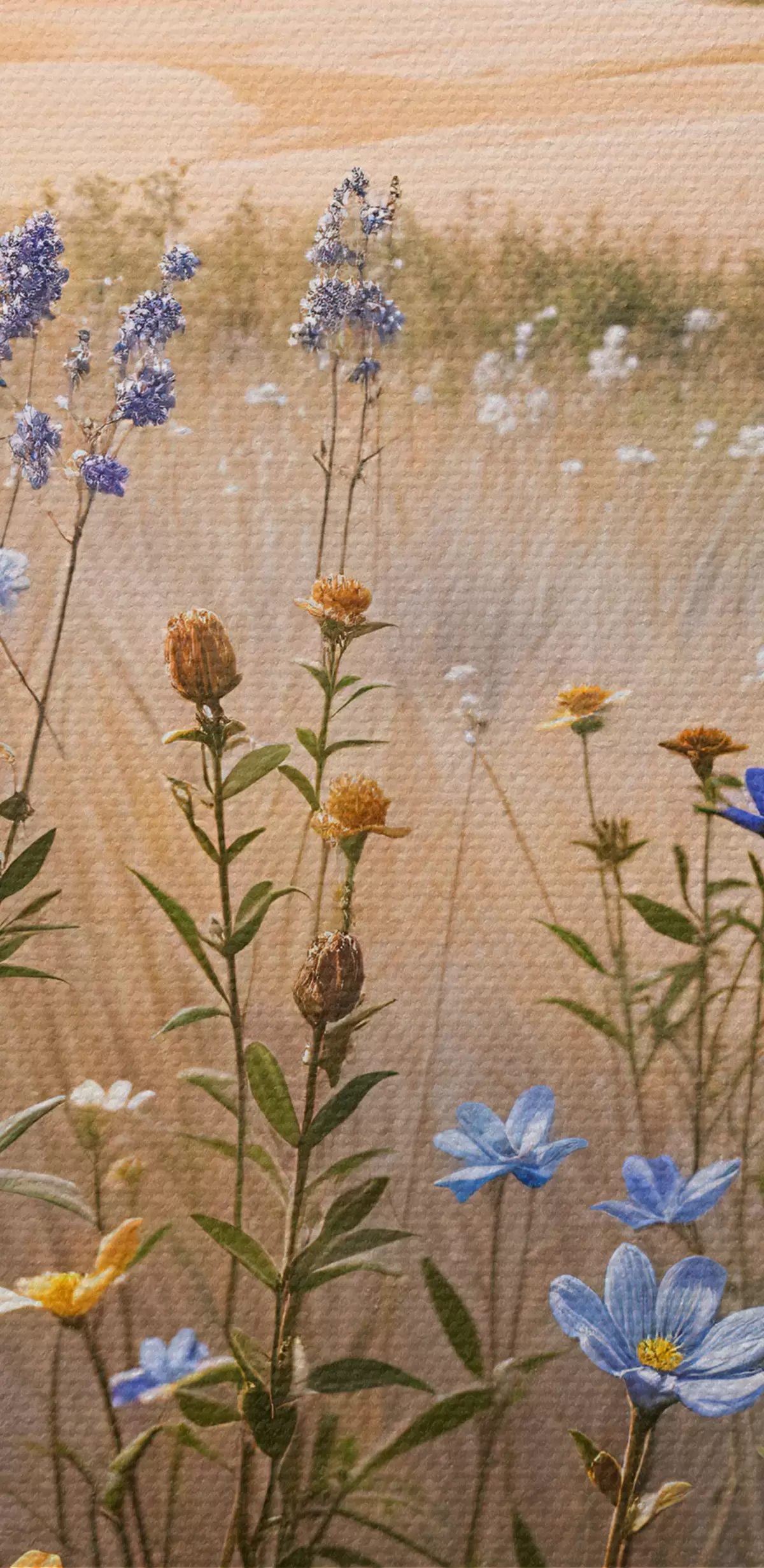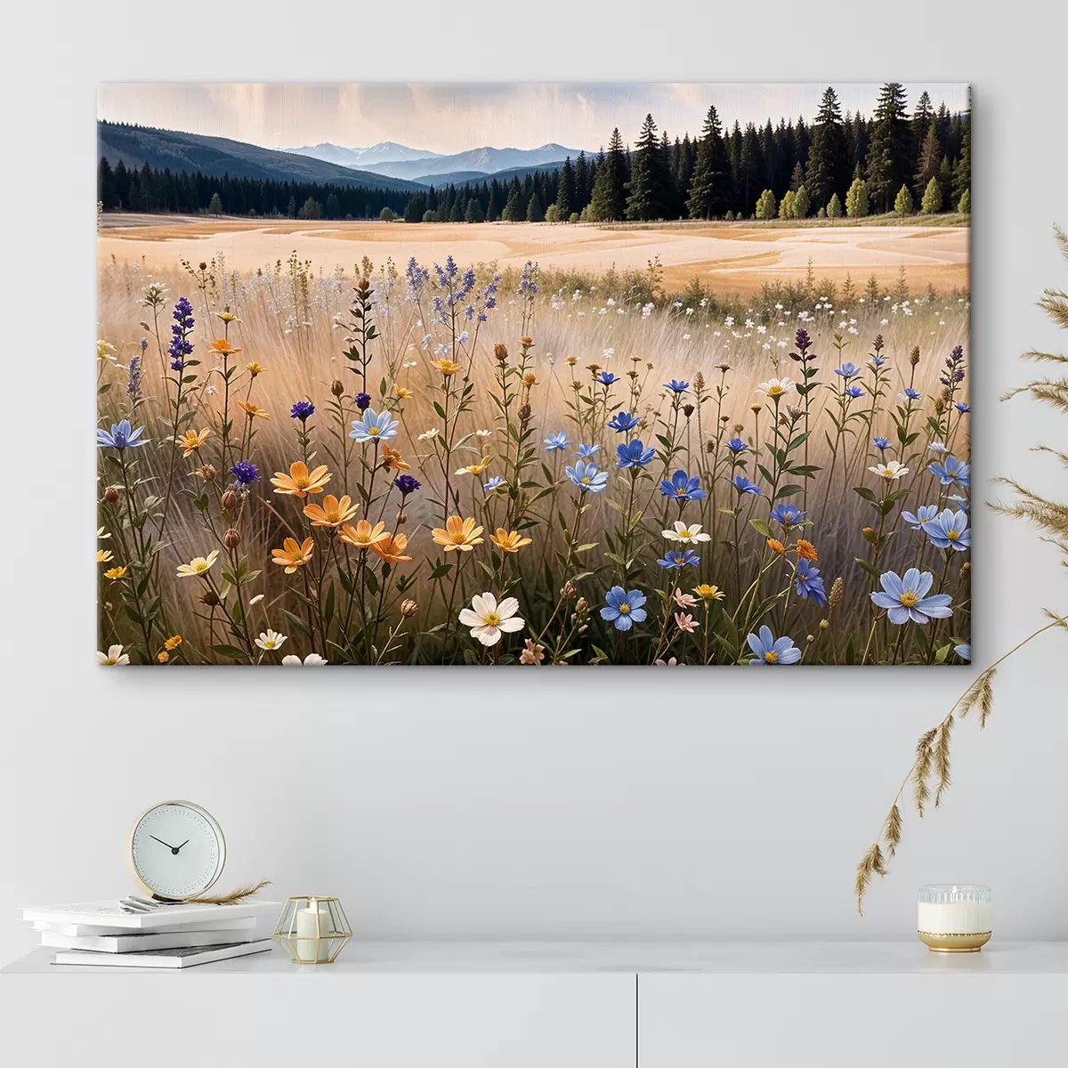 Schilderij Een veld met kleurrijke wilde bloemen op de voorgrond, met een meer en bergen op de achtergrond Art. s39502