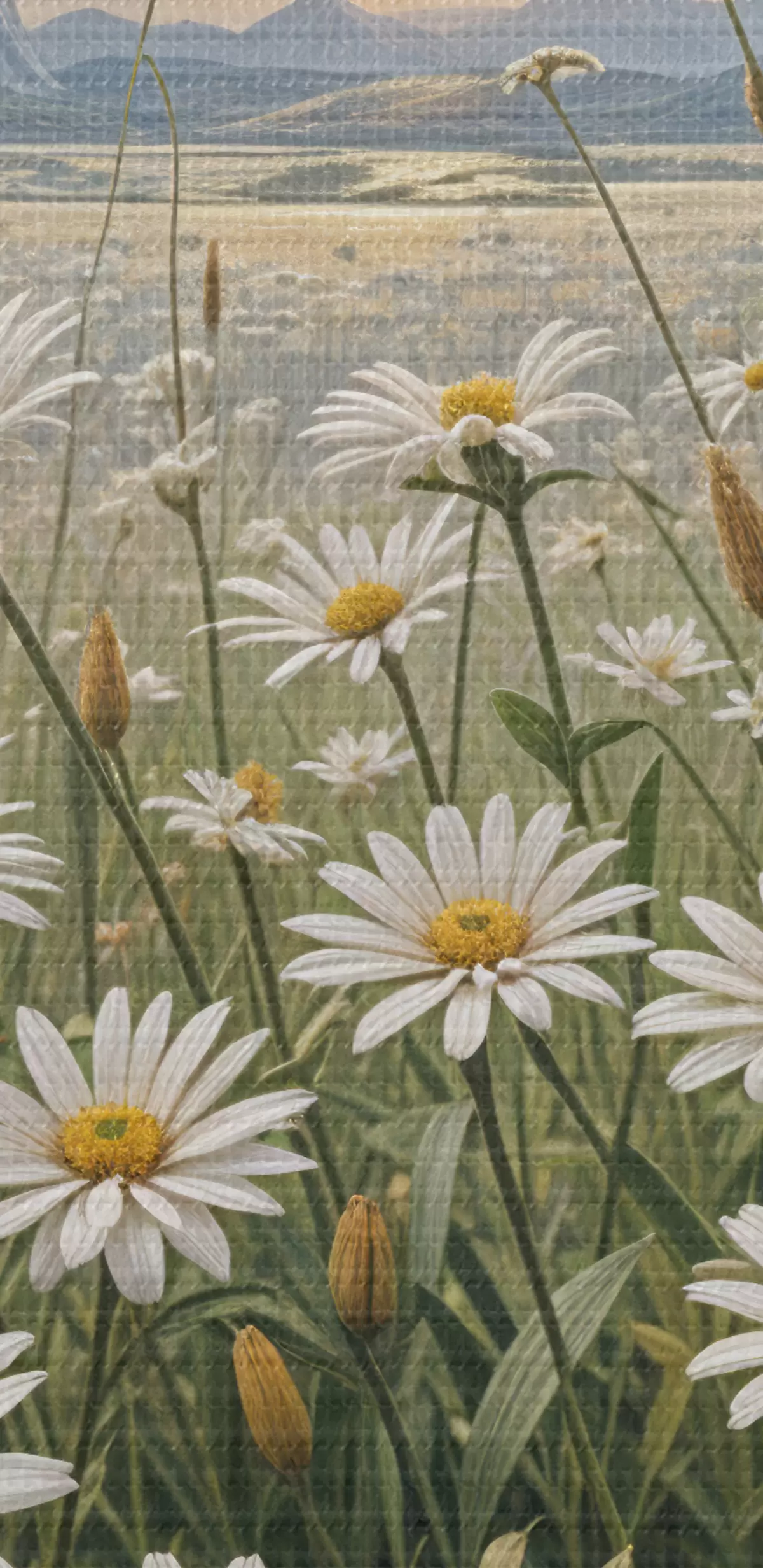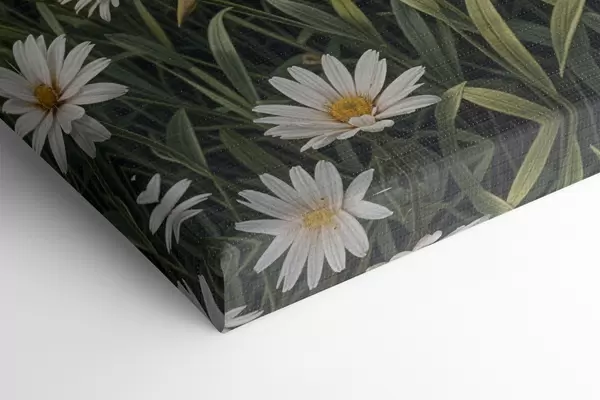 Schilderij Een veld met witte margrietbloemen op de voorgrond met een landschap van bergen en een bewolkte hemel Art. s39528