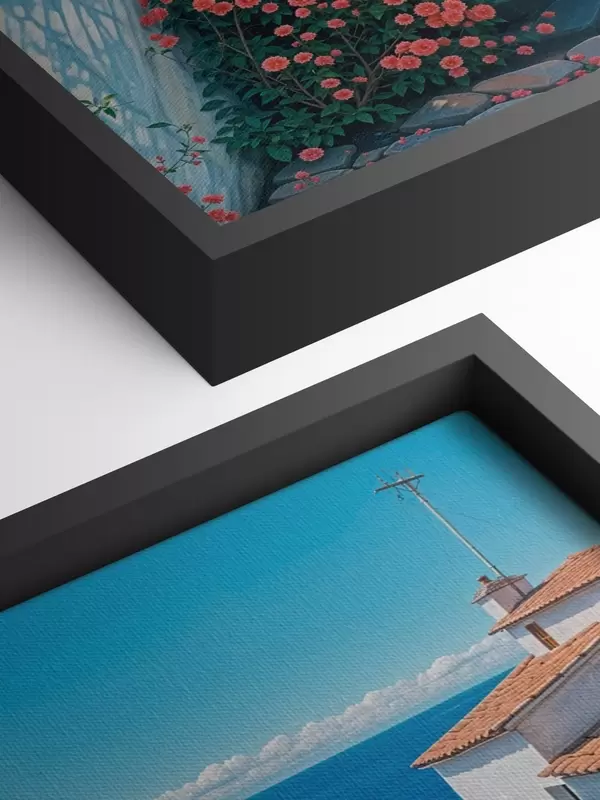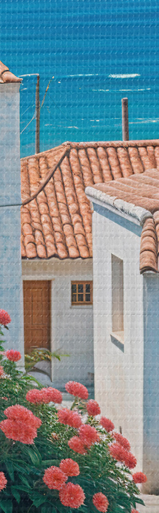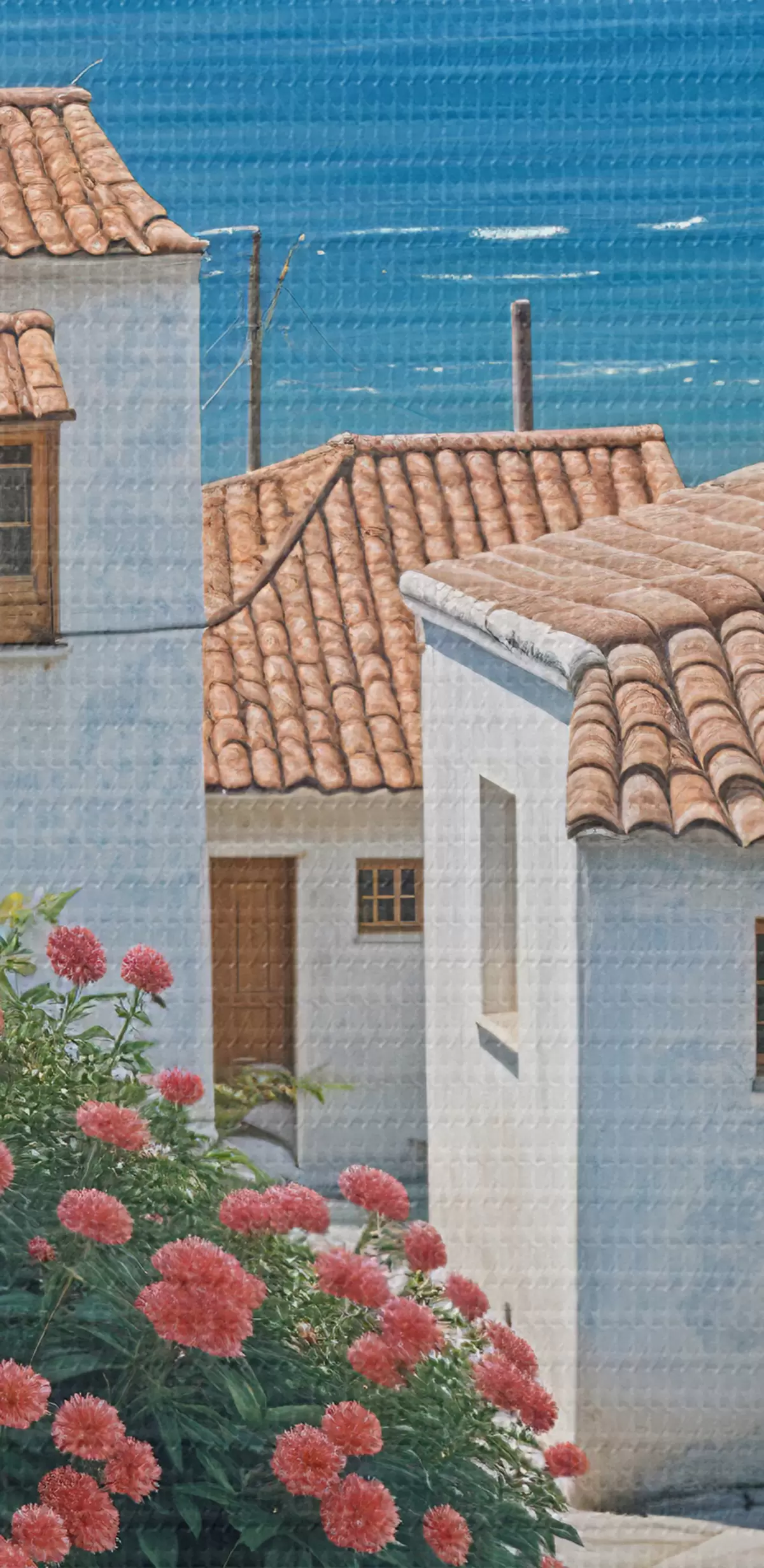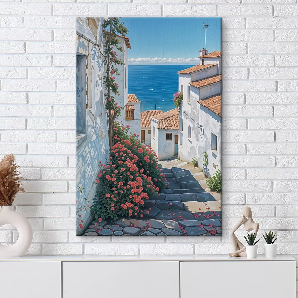 Schilderij Een smal straatje in een kustplaats, met witte gebouwen, rode pannendaken en levendige roze bloemen Art. s39532