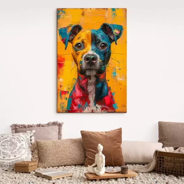 Schilderij Portret van een Pitbull met gele en blauwe olieverfstreken Art. s39722