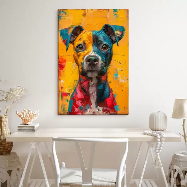 Schilderij Portret van een Pitbull met gele en blauwe olieverfstreken Art. s39722