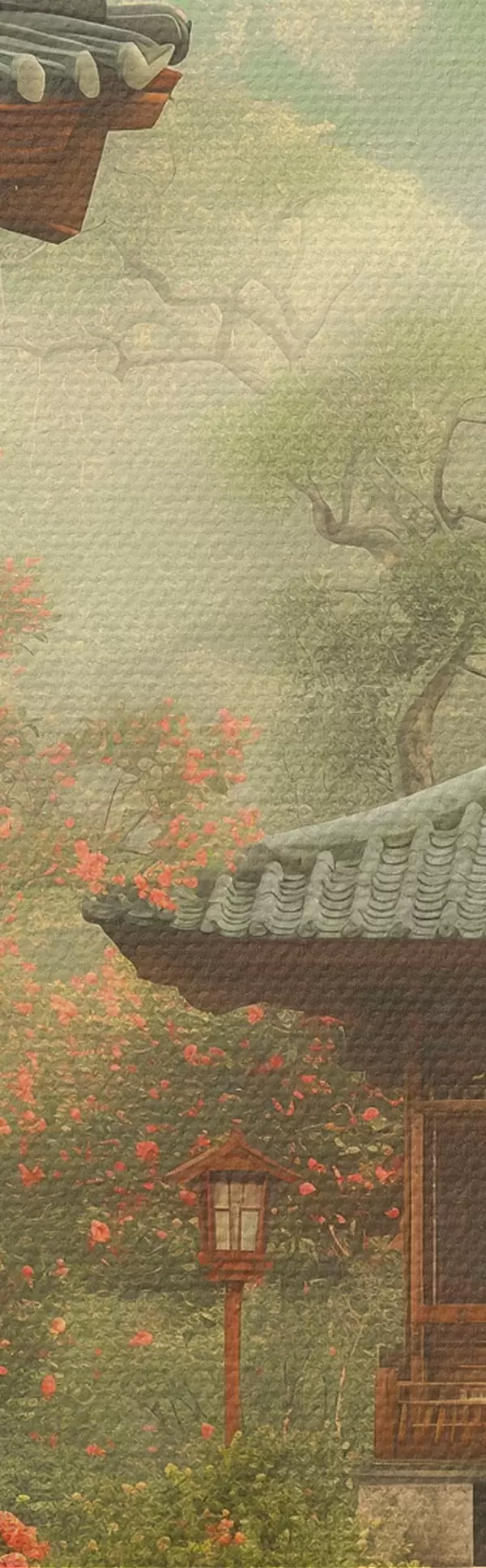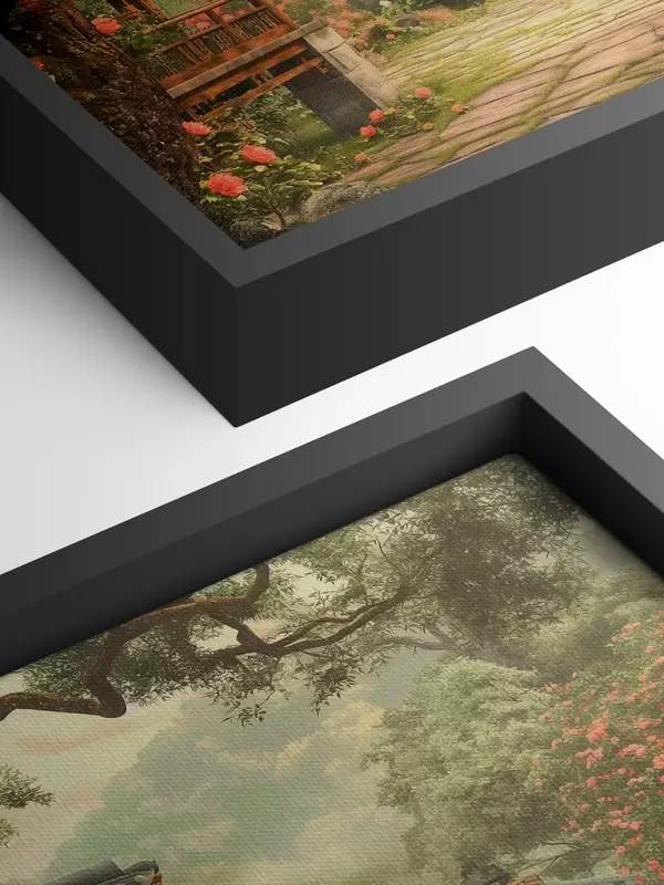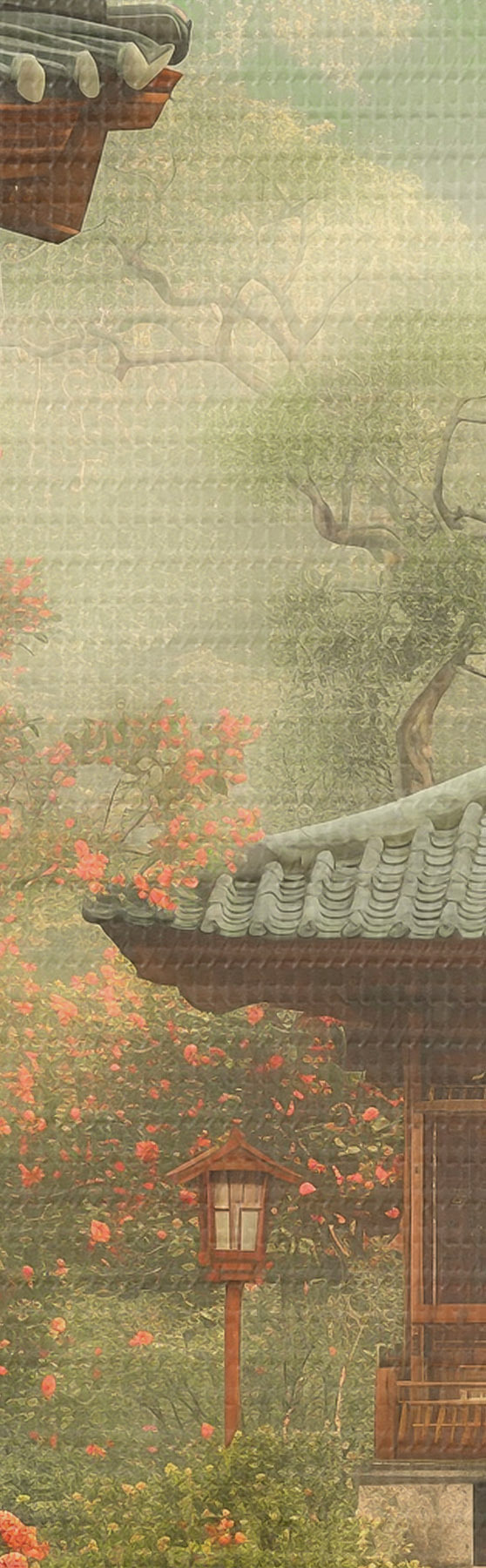Schilderij Japans park met bloeiende bomen en bloemen, bos, houten huis Art. s39773