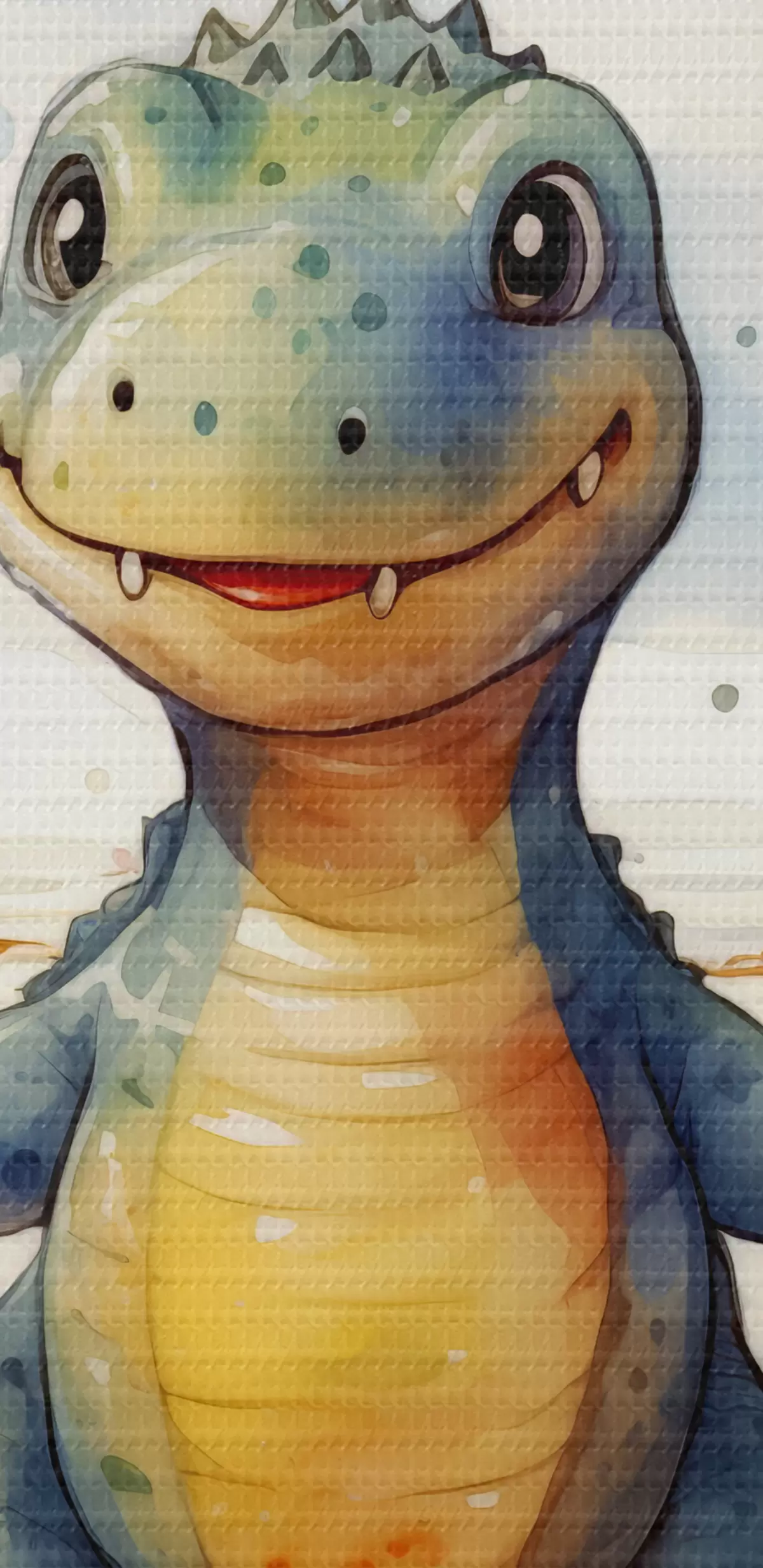 Schilderij Dinosaurus in de rivier tegen de achtergrond van bergen en varens aquarel Art. s39930