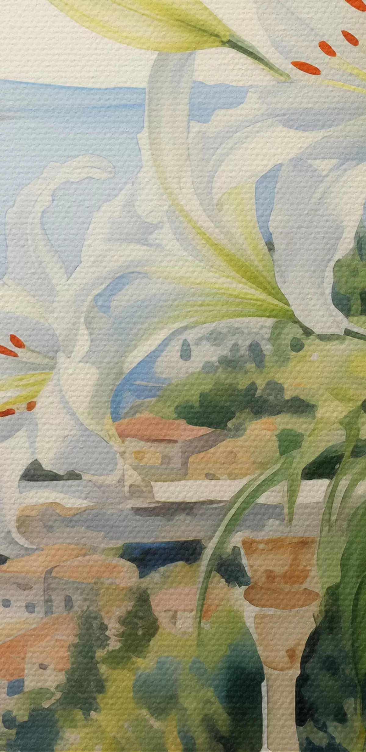 Schilderijen Witte lelies in een pot op een balkon tegen de achtergrond van de baai aquarel s39932