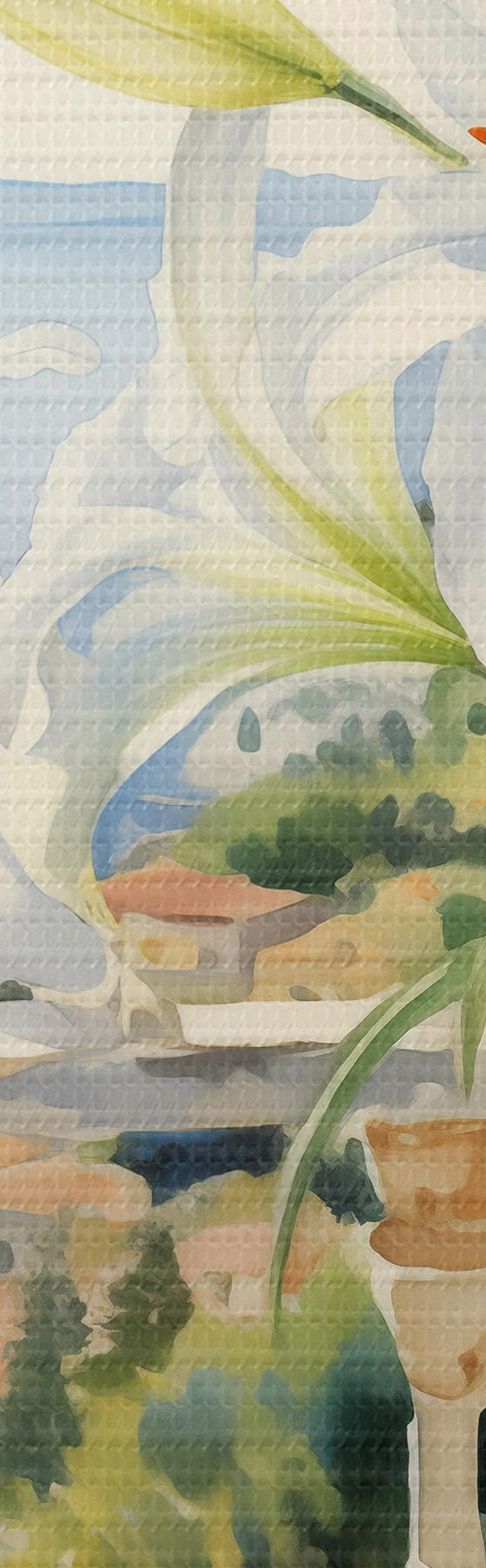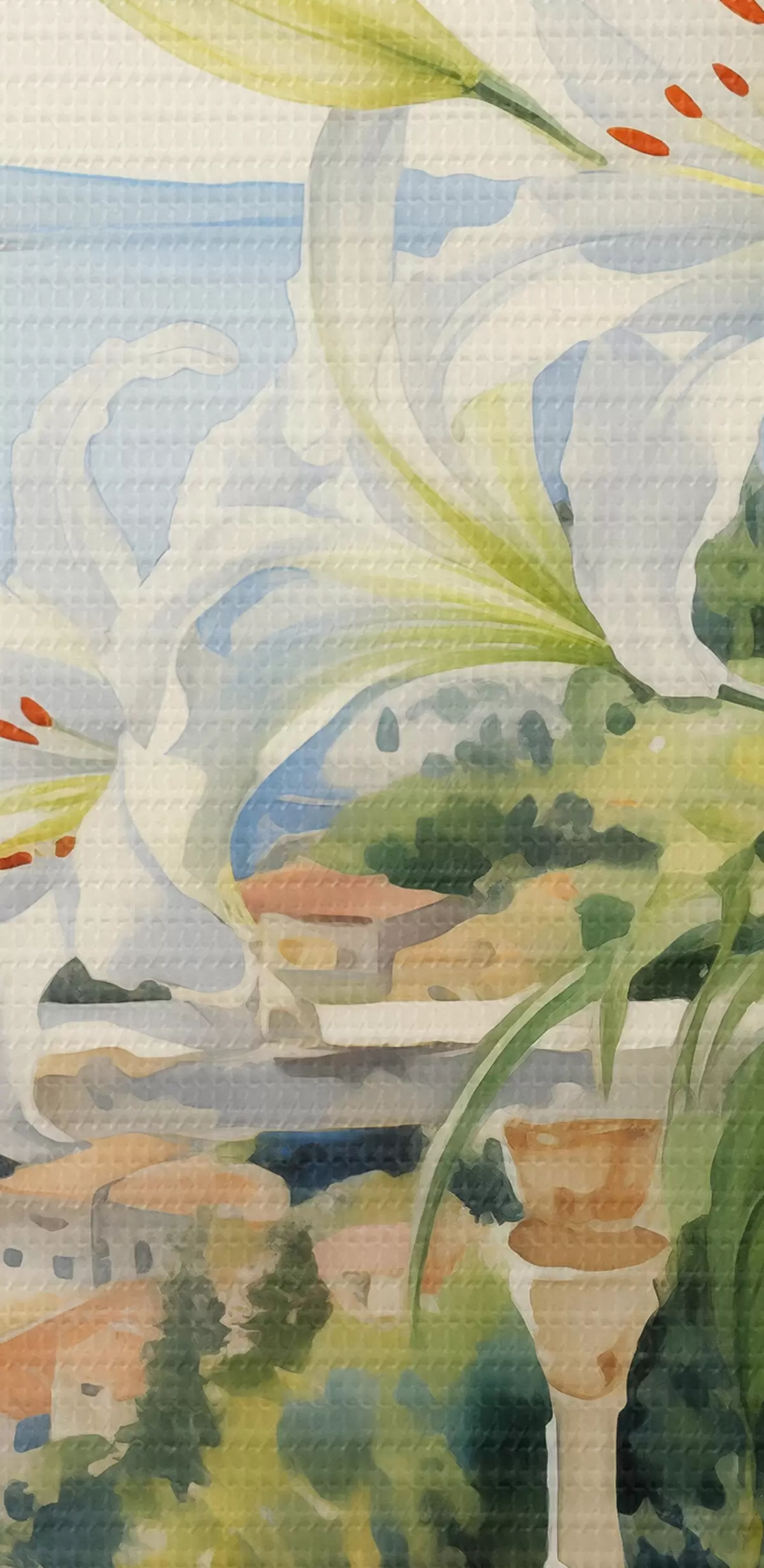 Schilderij Witte lelies in een pot op een balkon tegen de achtergrond van de baai aquarel Art. s39932