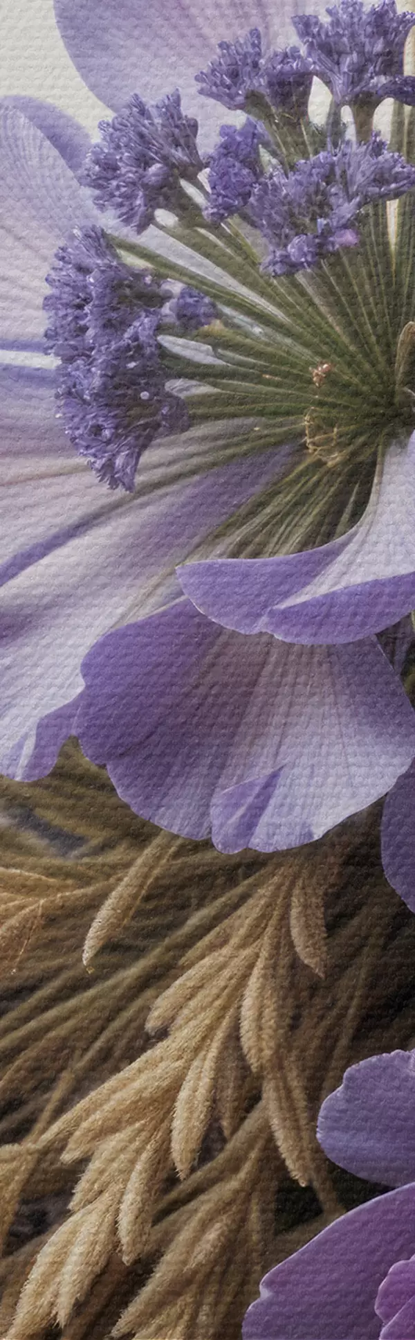 Schilderij Een boeket van paarse bloemen, waaronder pioenrozen en lavendel, met tarwestengels op een lichte achtergrond Art. s40030