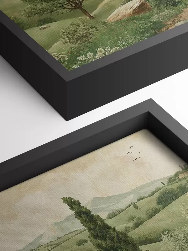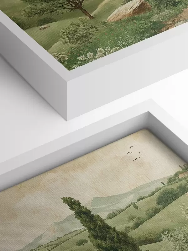 Schilderijen Toscaans landschap, vintage stijl, pastelgroene kleuren, heuvels en bomen s40075