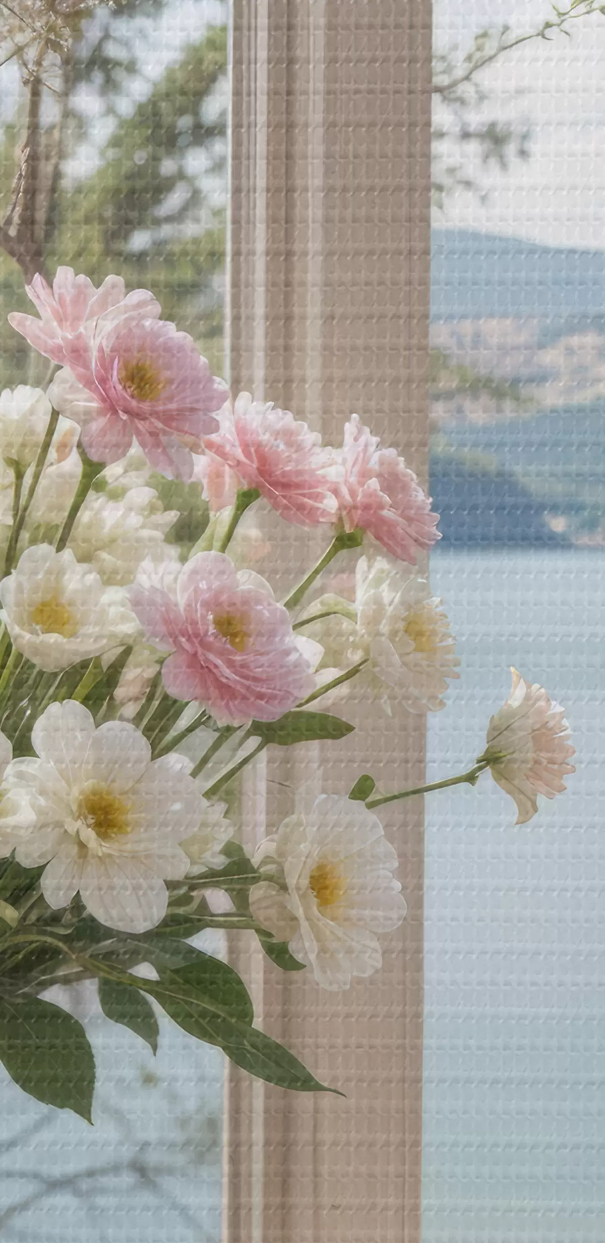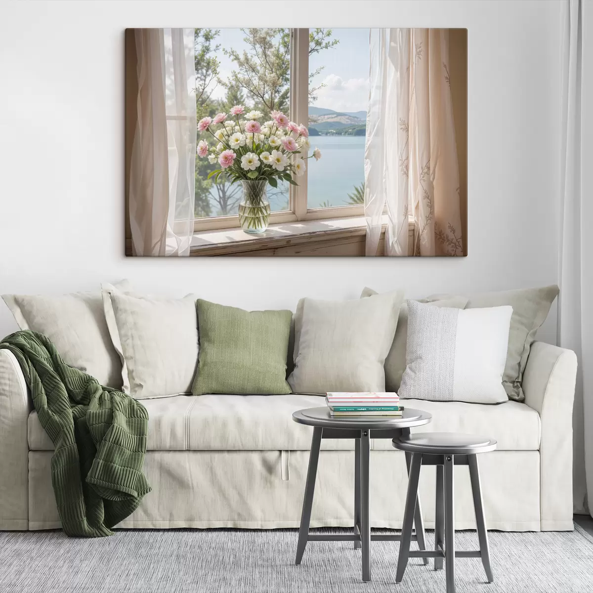 Schilderij Een boeket van roze en witte bloemen in een glazen vaas op een vensterbank, met een schilderachtig meer en bergen Art. s40151