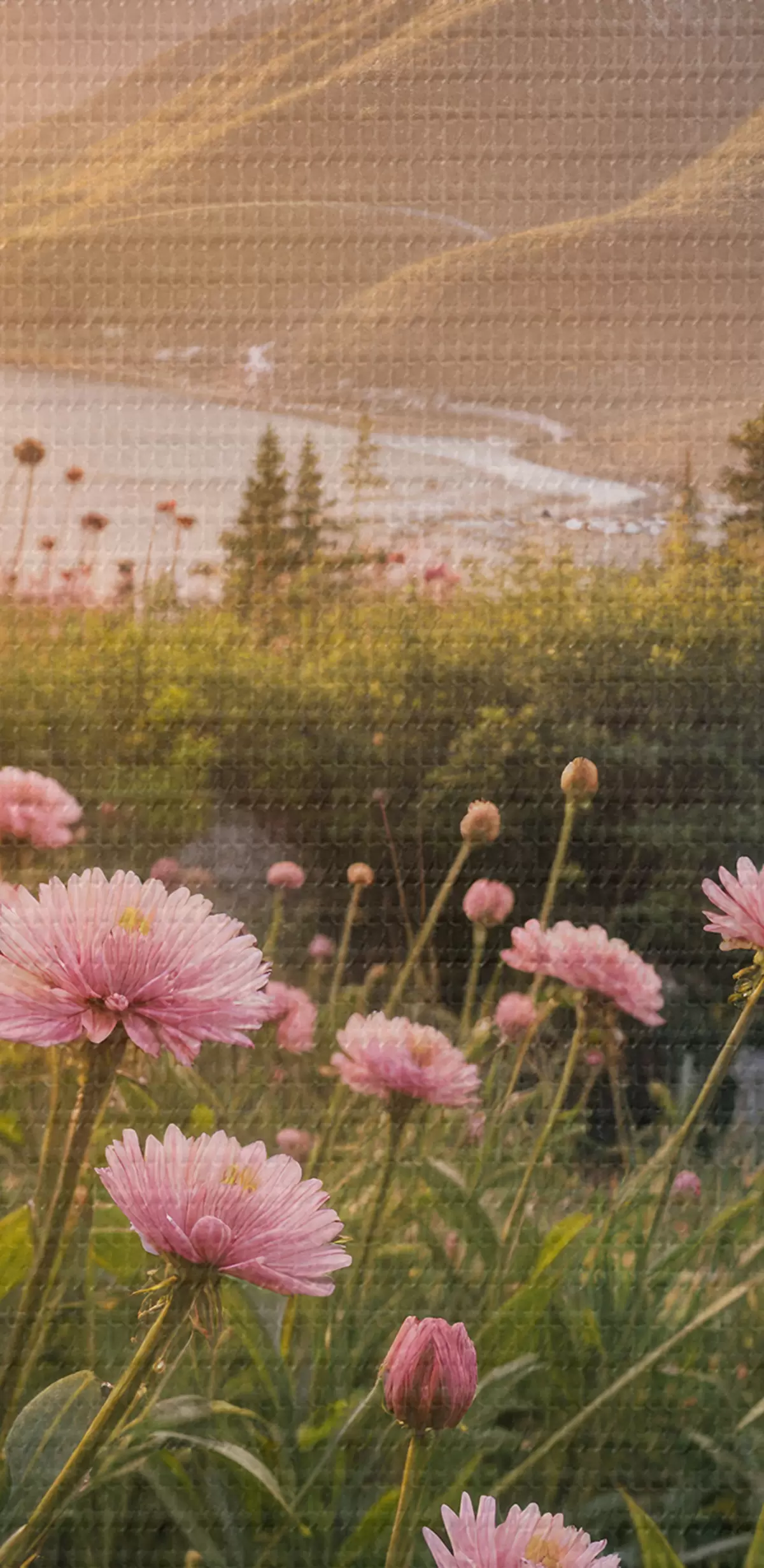 Schilderij Een veld met roze madeliefachtige bloemen op de voorgrond, met een groot gebergte op de achtergrond Art. s40154