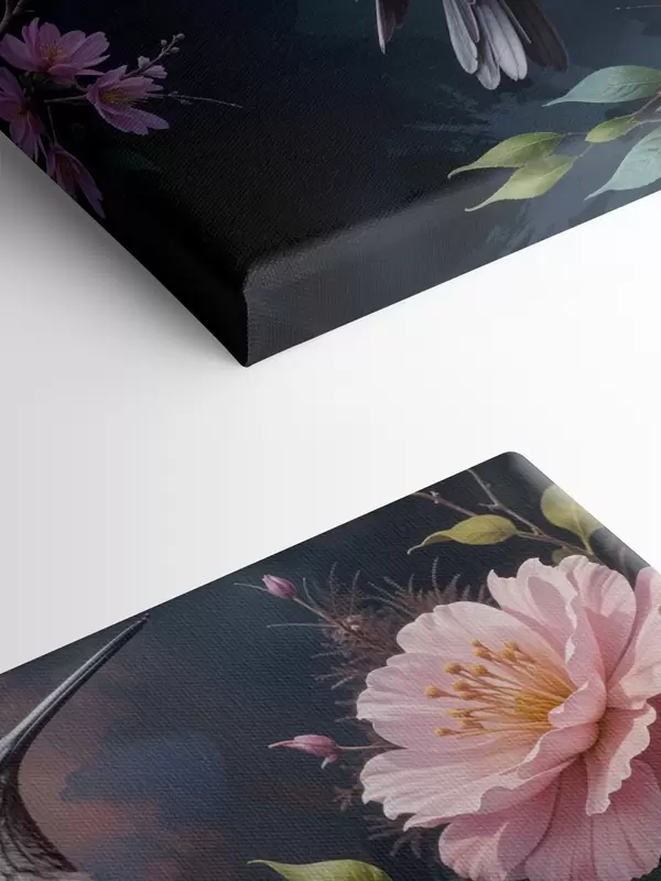 Schilderij Een kleurrijke kolibrie zit op een tak met op de achtergrond levendige roze bloemen Art. s40155
