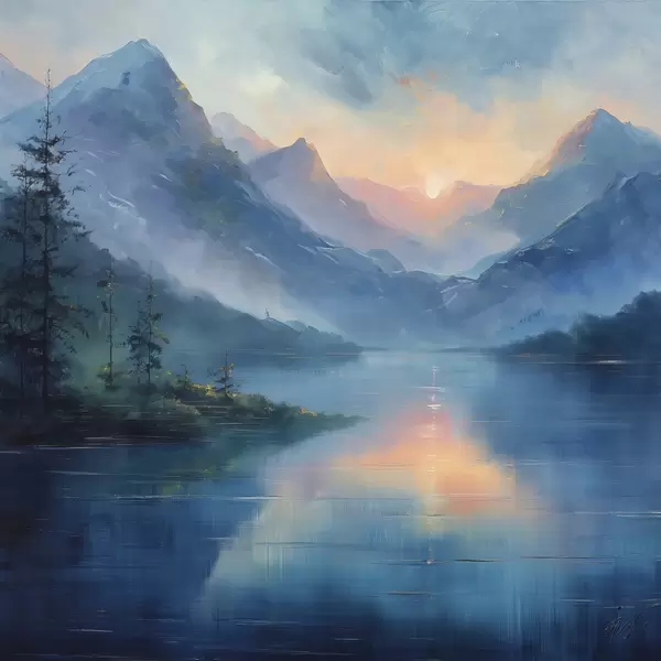 Schilderijen Zonsondergang in de bergen, mist, rivier, forеst, olieverfschilderij s40302