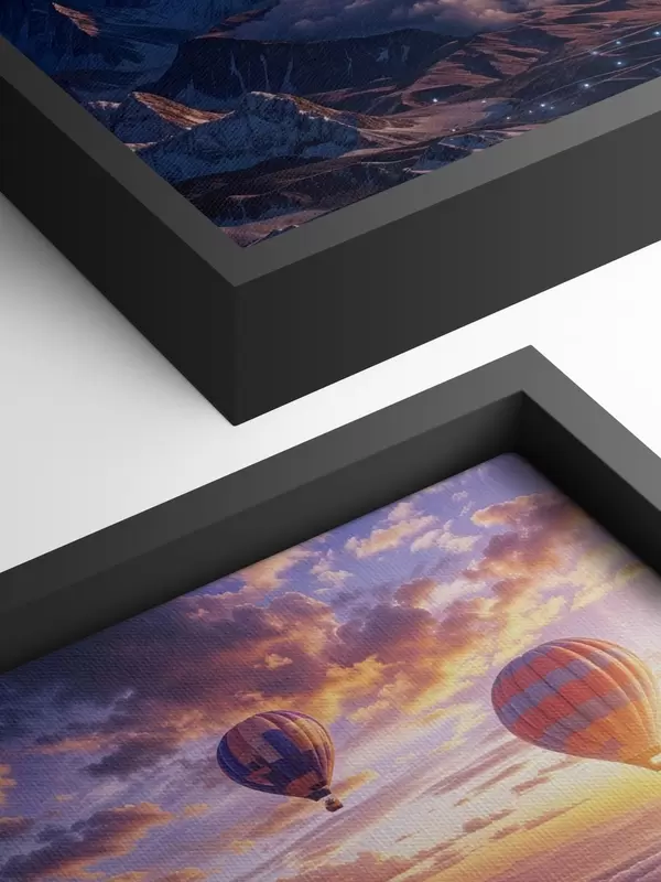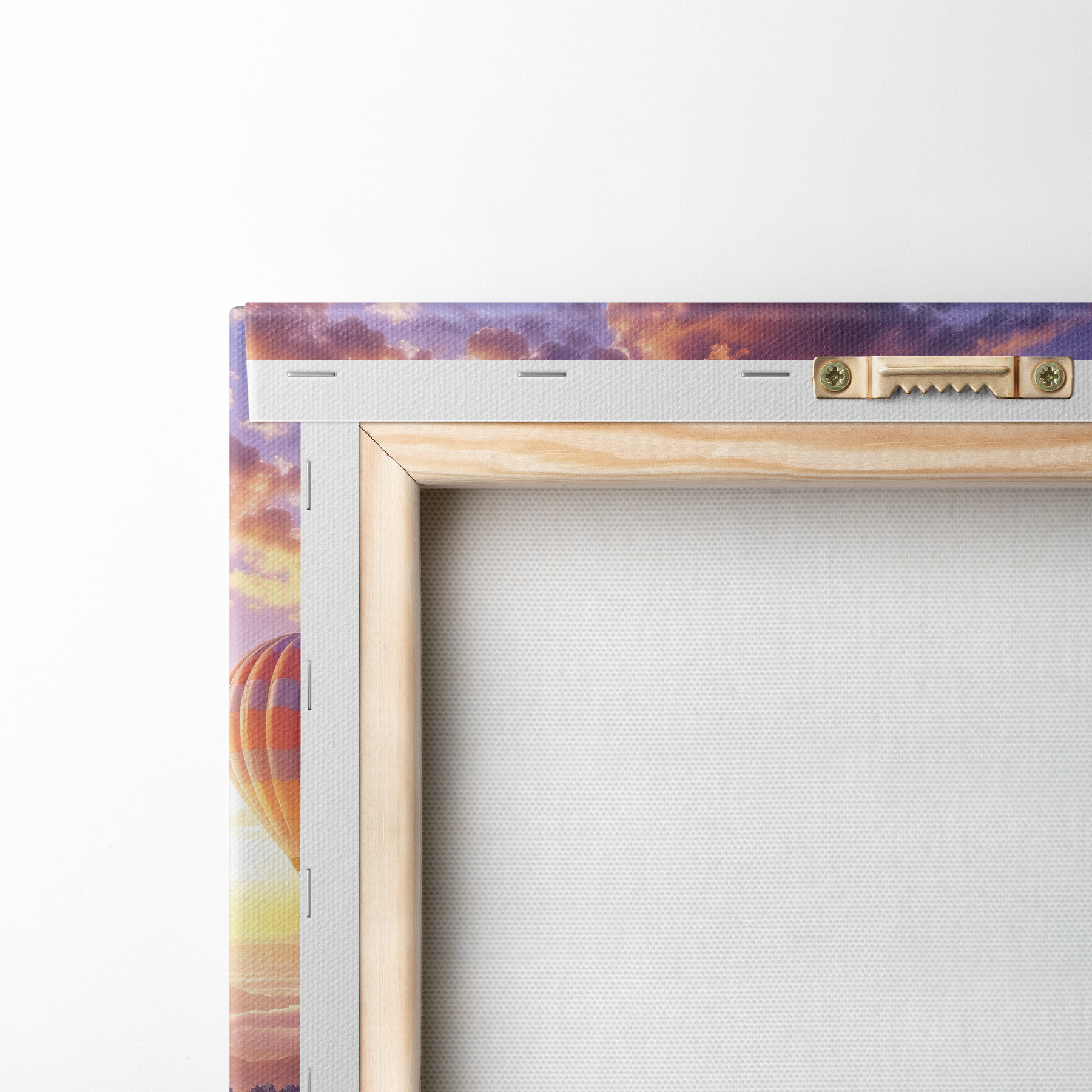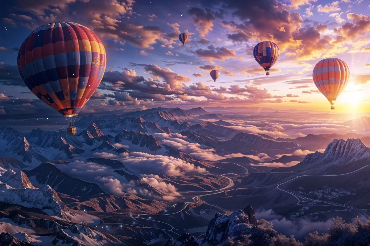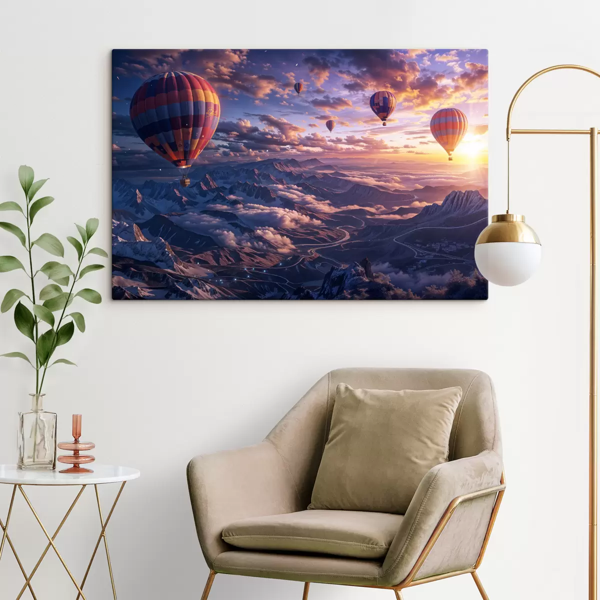 Schilderij Heteluchtballonnen zweven over een bergachtig landschap bij zonsondergang, met wolken en levendige kleuren in de lucht Art. s40397