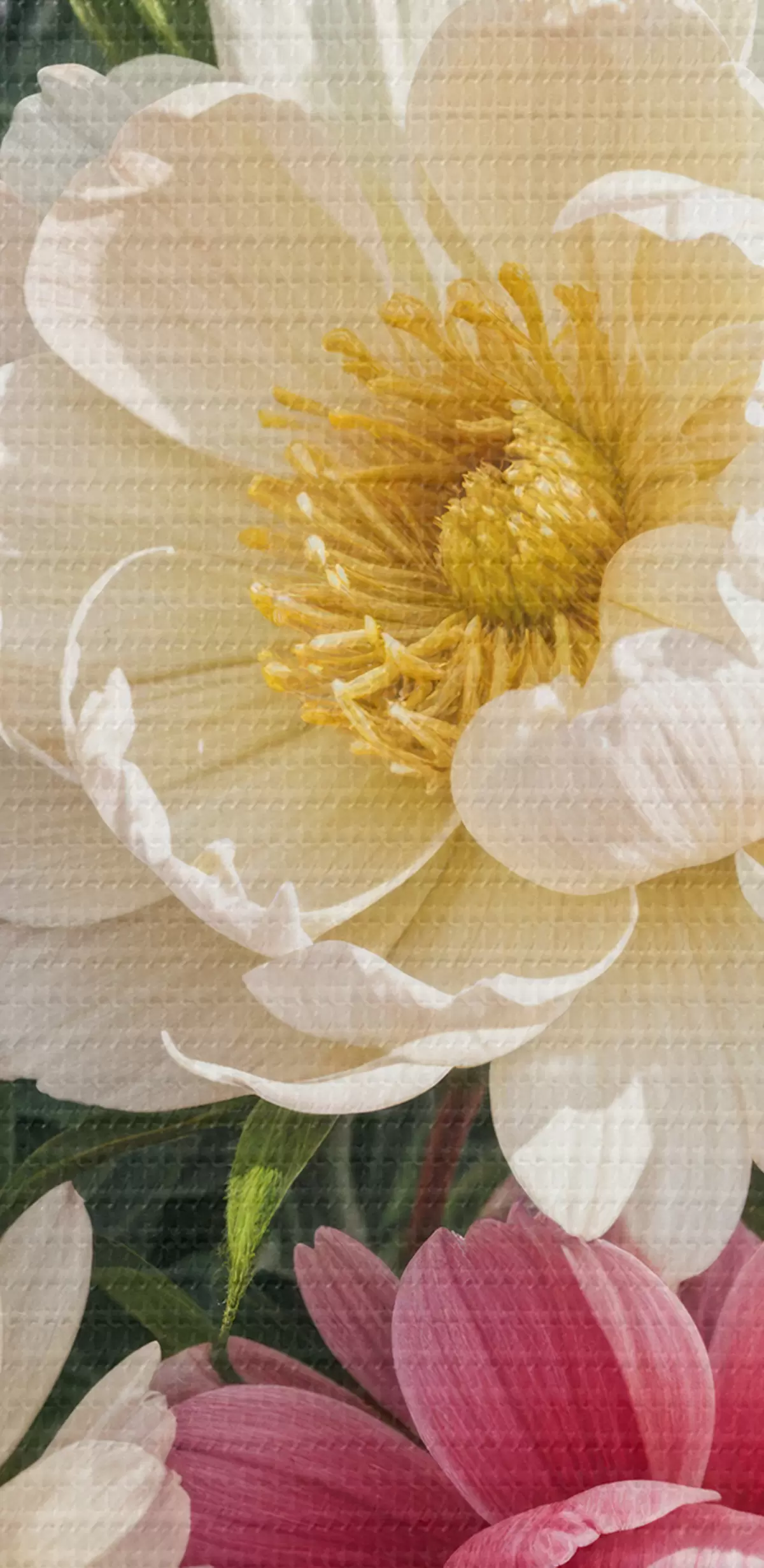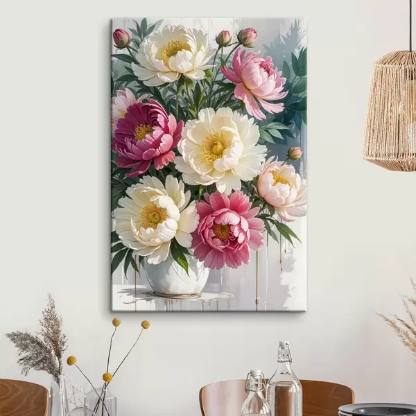 Schilderij Een boeket van levendige pioenrozen in verschillende tinten roze, wit en geel met verfspatten Art. s40403