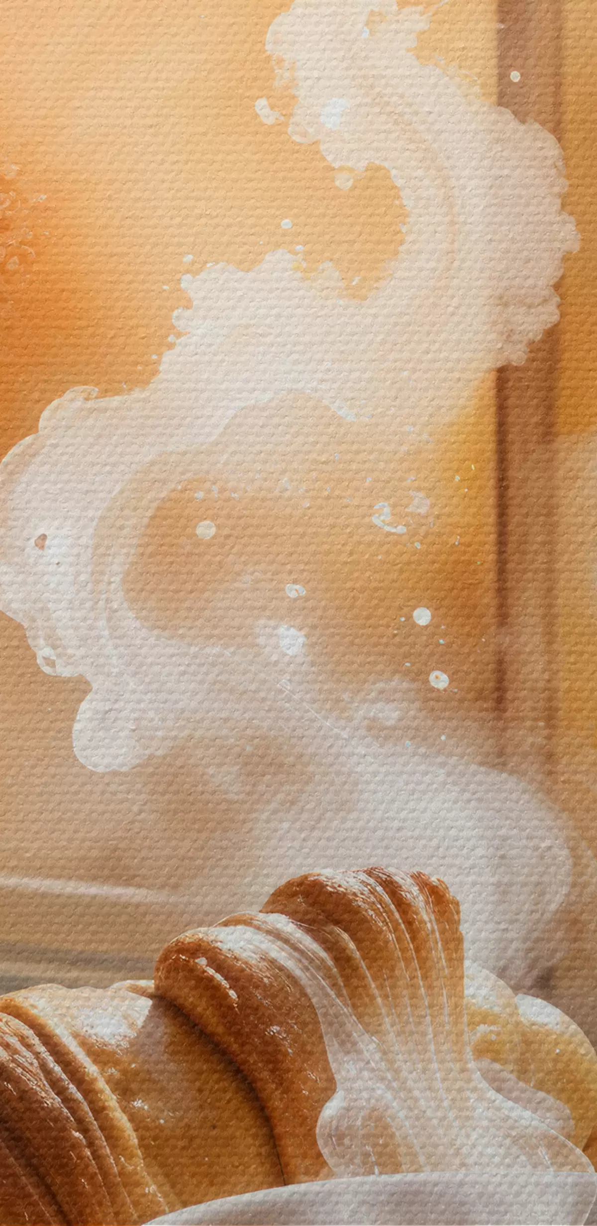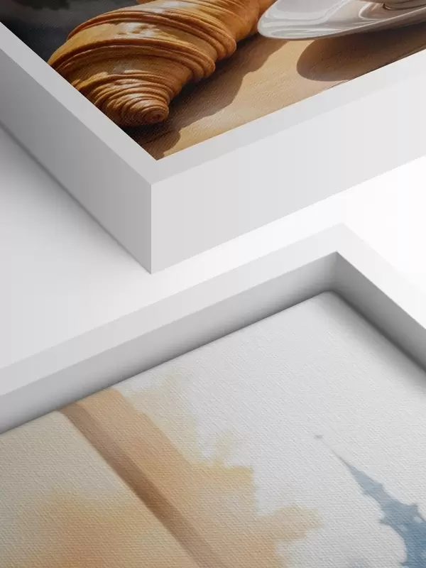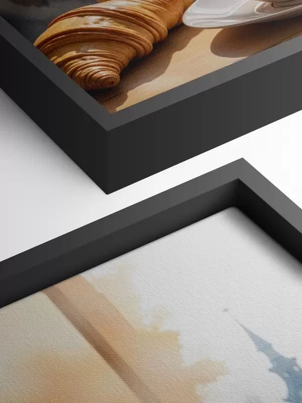 Schilderij Een warme kop koffie met opstijgende stoom, op een tafeltje naast een croissant, met uitzicht op een historisch gebouw Art. s40405
