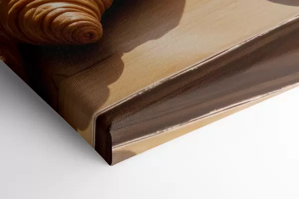 Schilderij Een warme kop koffie met opstijgende stoom, op een tafeltje naast een croissant, met uitzicht op een historisch gebouw Art. s40405
