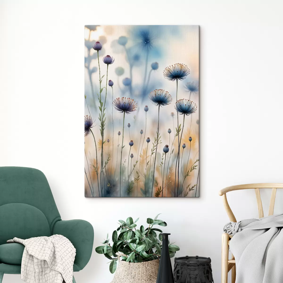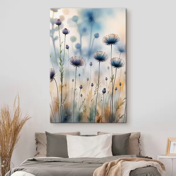 Schilderij Hoge paarse paardenbloemachtige bloemen met een wazige achtergrond, die een serene en dromerige sfeer creëren Art. s40414