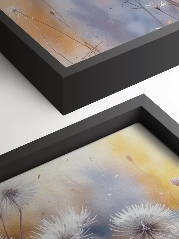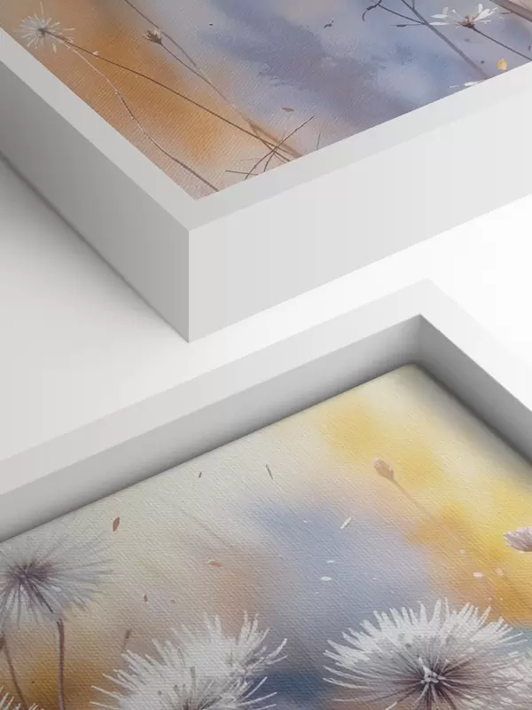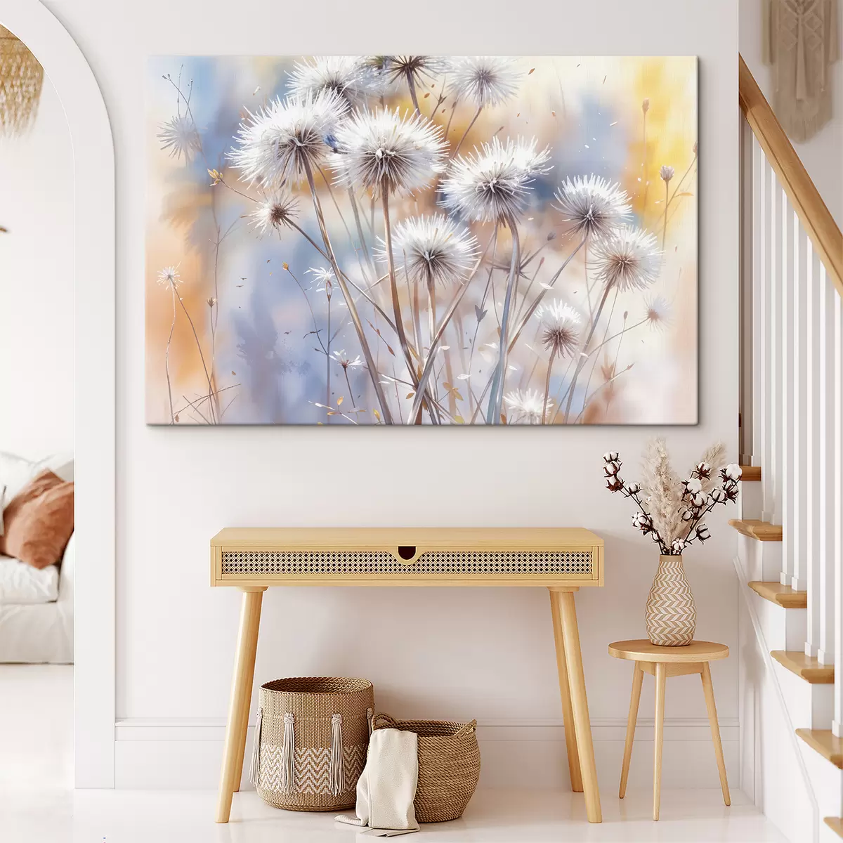Schilderij Pluizige witte paardenbloembloemen tegen een wazige aquarelachtergrond met warme belichting Art. s40541