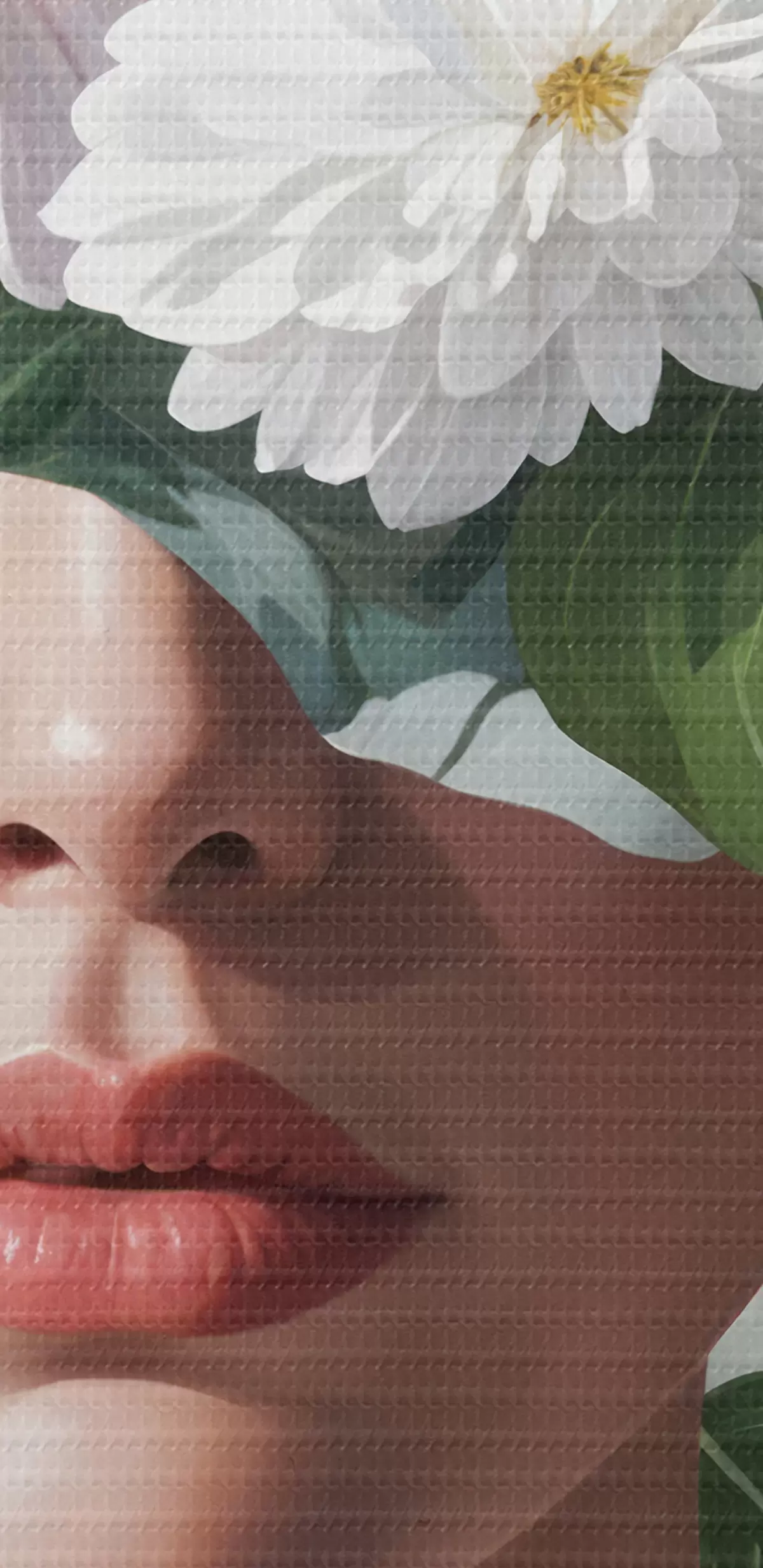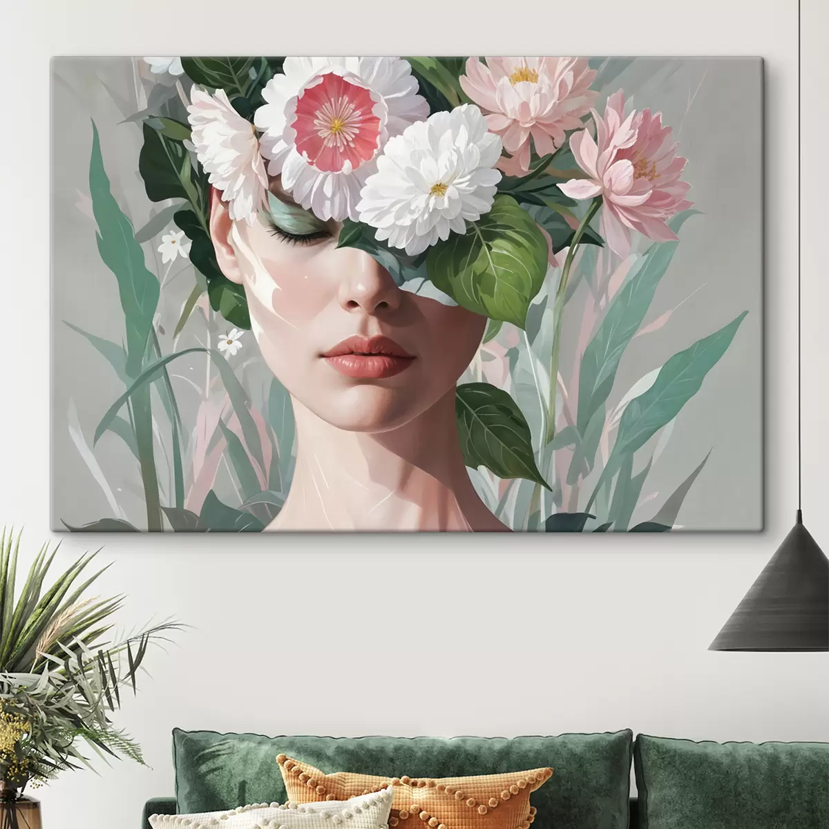 Schilderij Een vrouw gedeeltelijk verborgen door een boeket grote roze en witte bloemen tegen een groene, bladrijke achtergrond Art. s40567