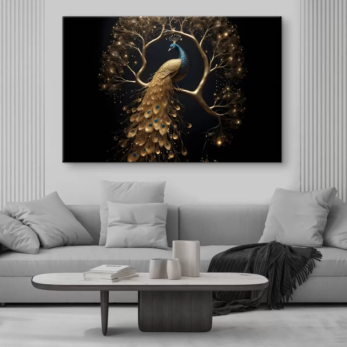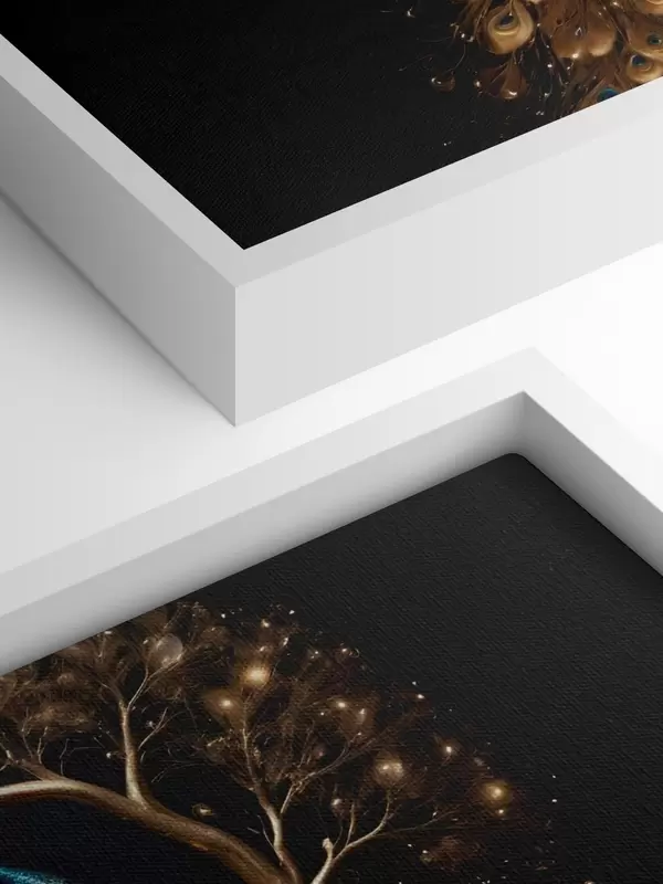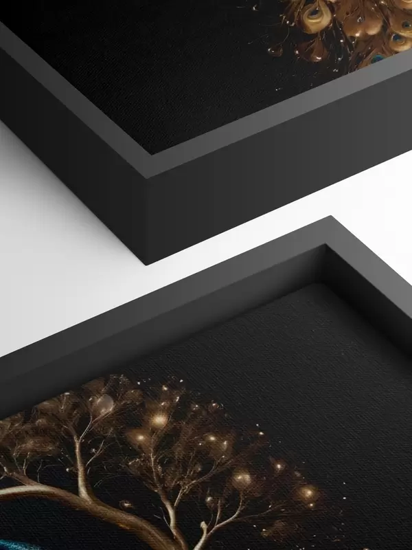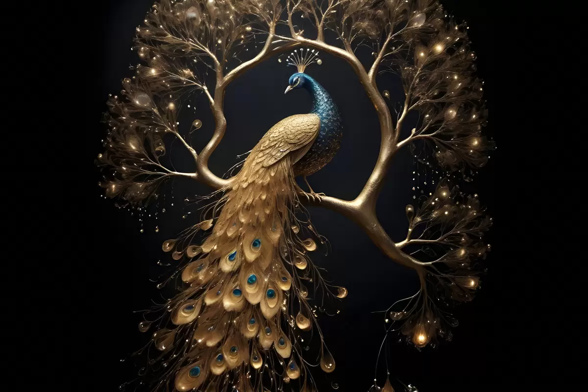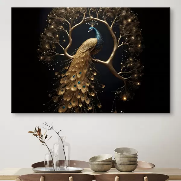 Schilderij Een pauw met levendige veren neergestreken op een tak tegen een donkere achtergrond met gloeiende bomen Art. s40612