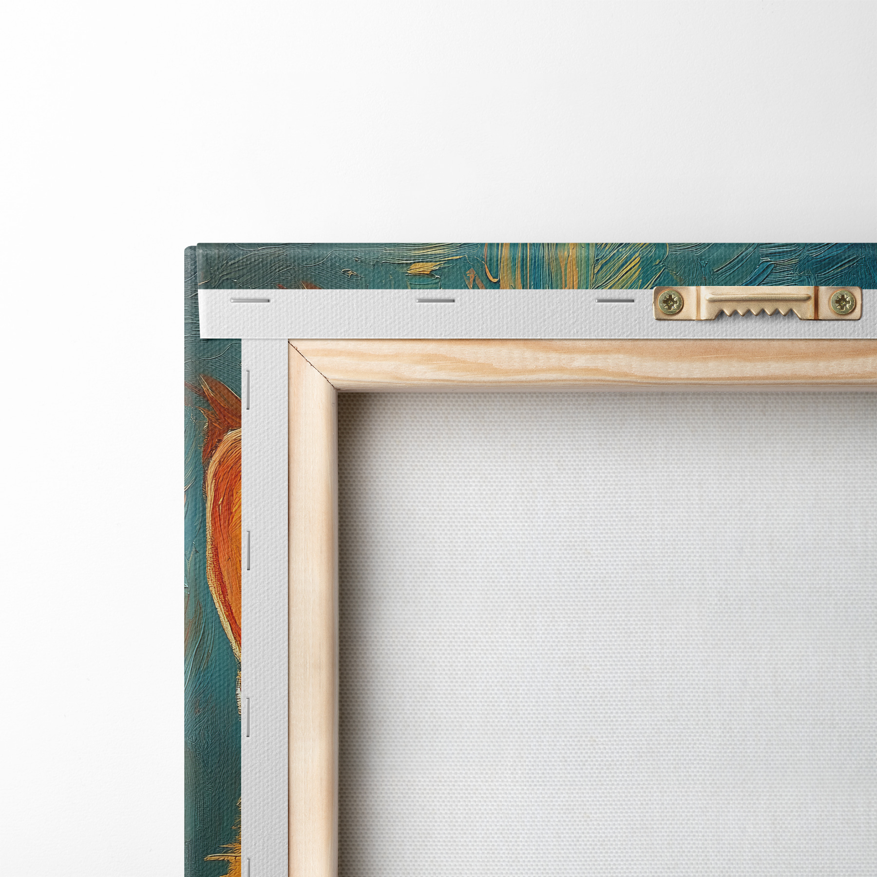 Je kunt het schilderij ophangen aan schroeven. Hiervoor leveren we bevestigingen bij onze foto's, zodat je de foto gemakkelijk kunt ophangen.