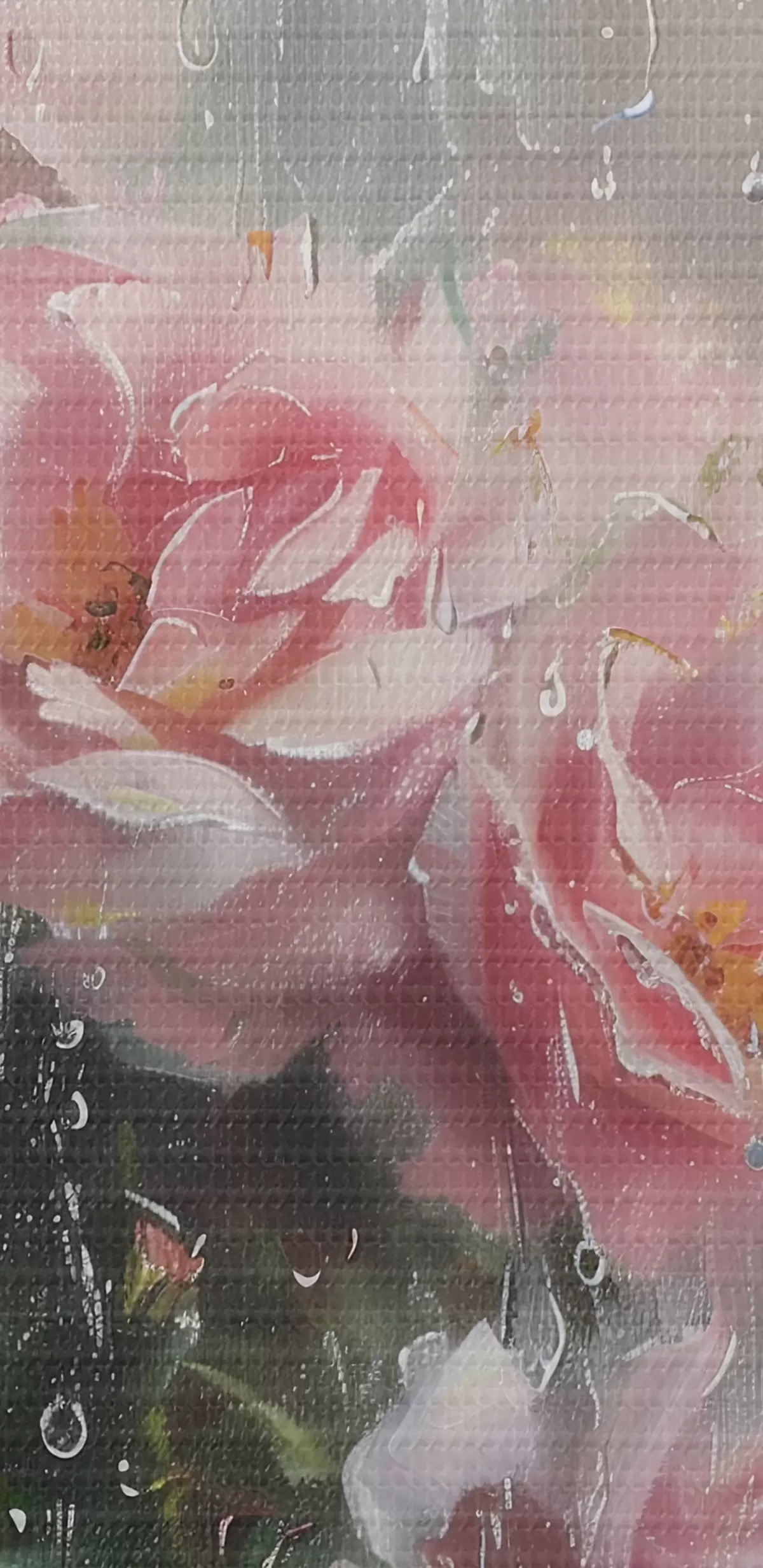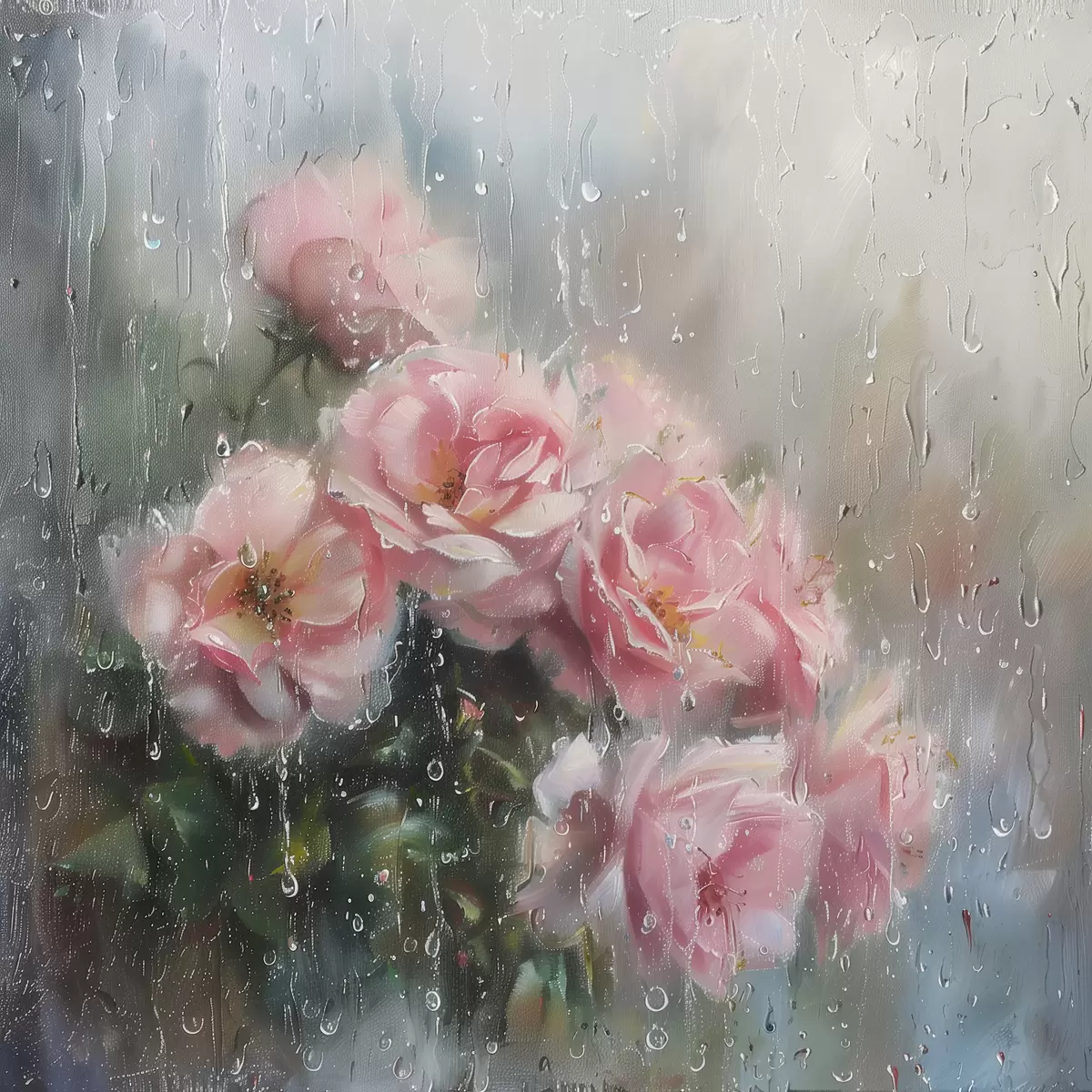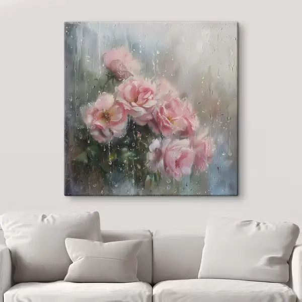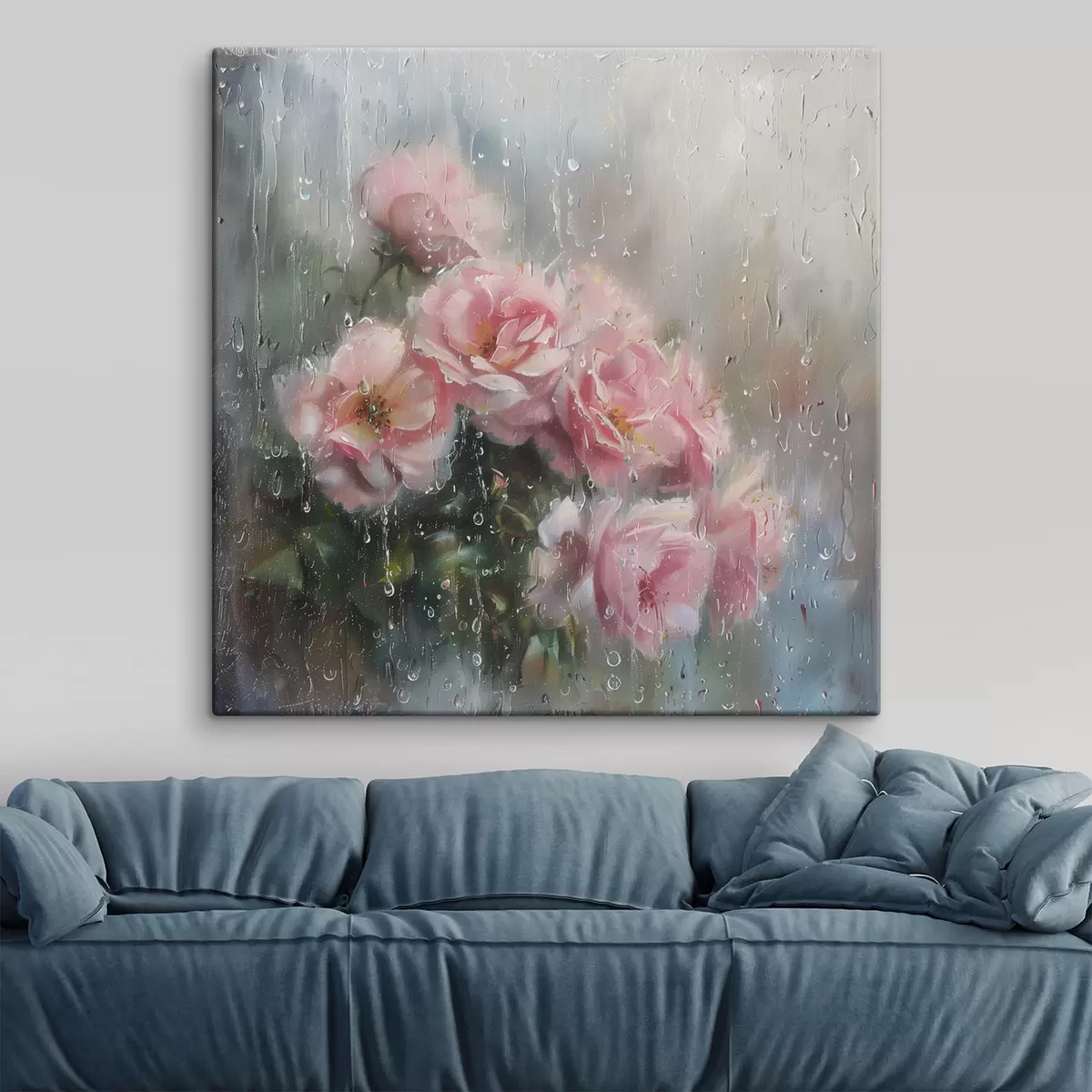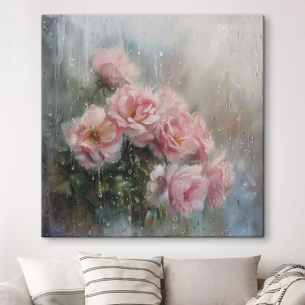 Schilderij Een boeket roze rozen voor het raam bij regenachtig weer Art. s40656
