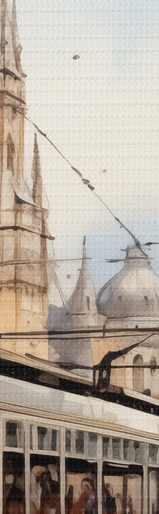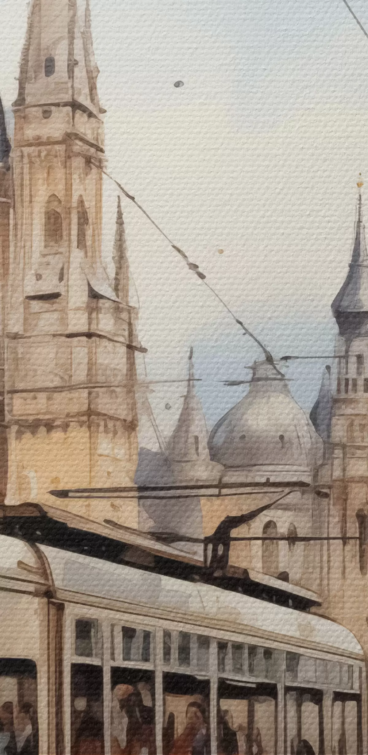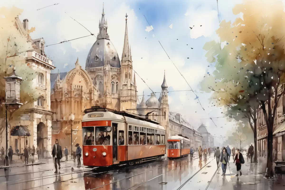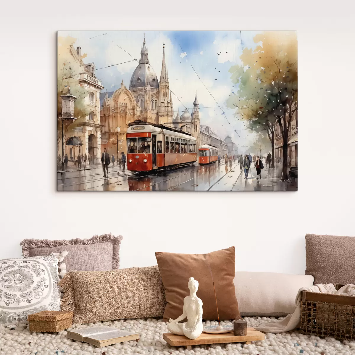 Schilderij Rode tram in de straat van Wenen aquarel Art. s40732