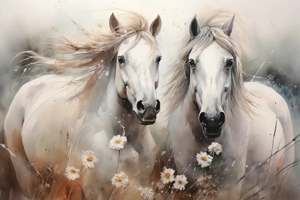 Schilderij Een paar witte en grijze paarden bij madeliefjes Art. s40749
