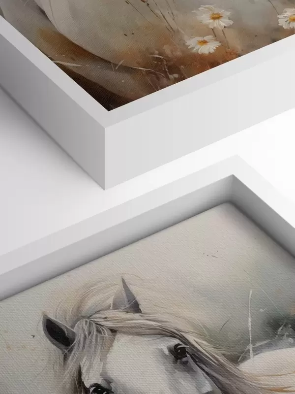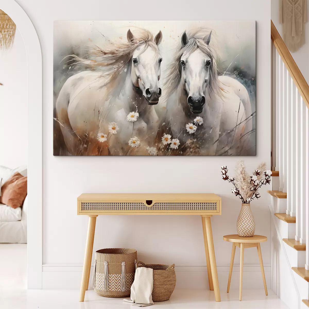 Schilderijen Een paar witte en grijze paarden bij madeliefjes s40749