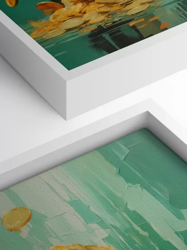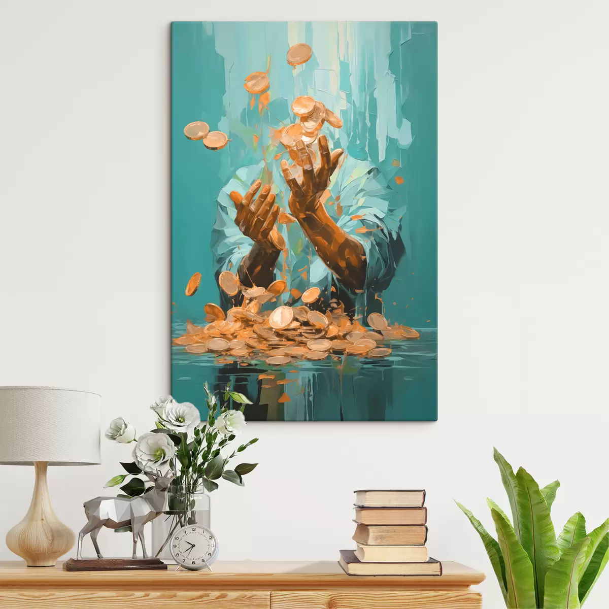 Schilderijen Abstract schilderij van een man omringd door munten s40755