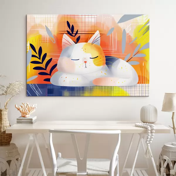 Schilderijen Een schattige kat slapend tussen de planten in een grafische stijl s40956