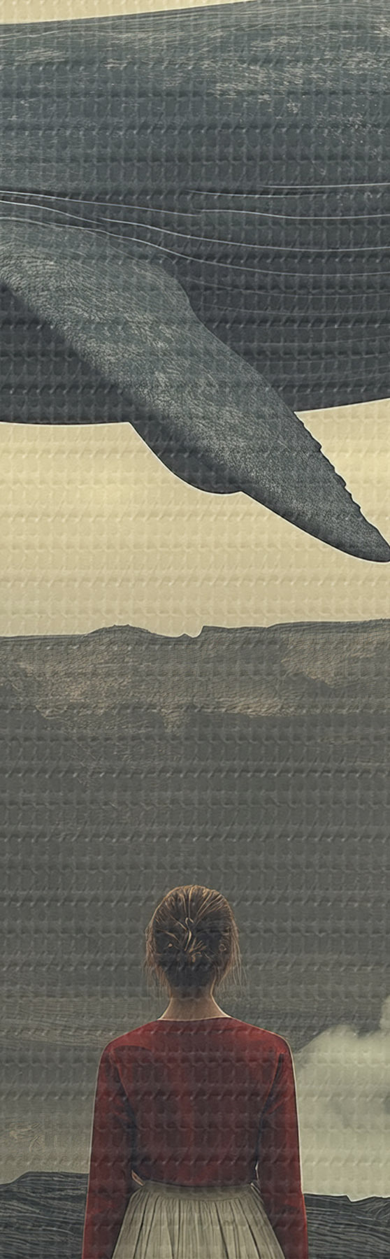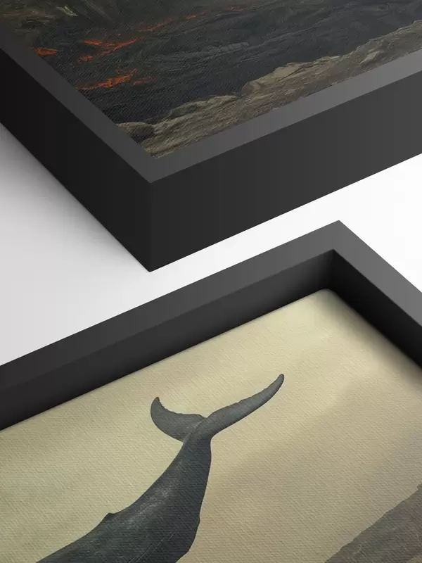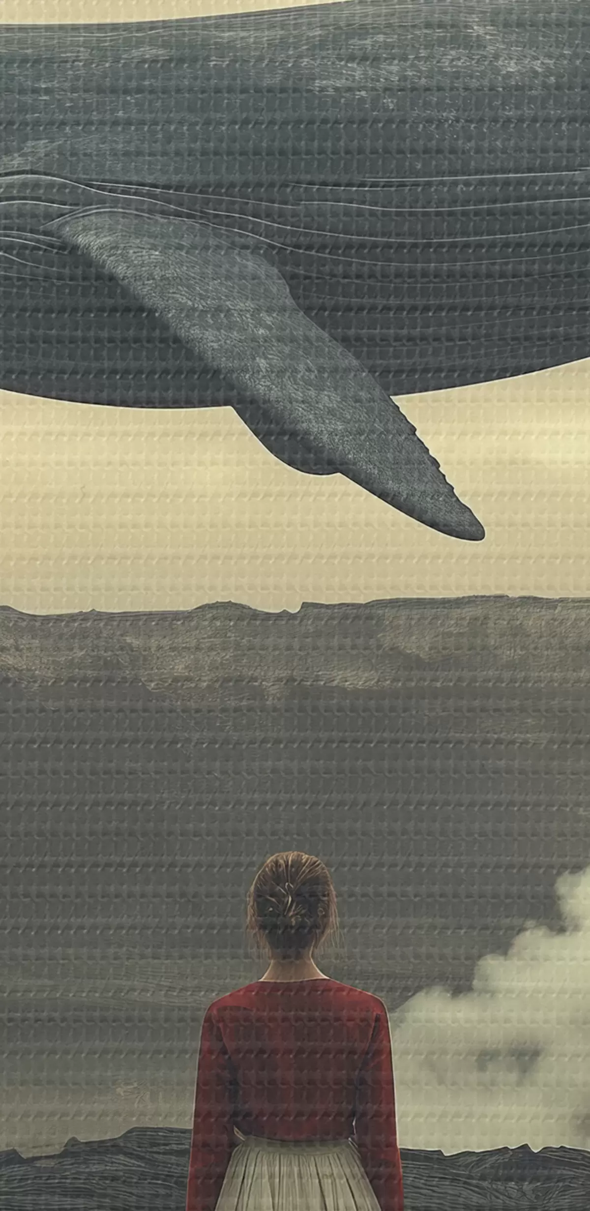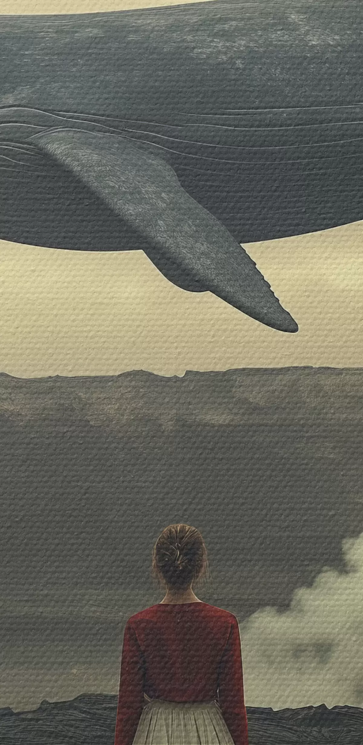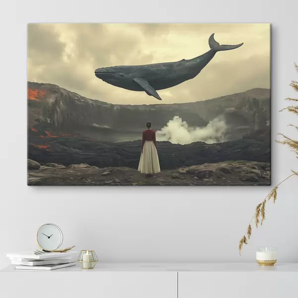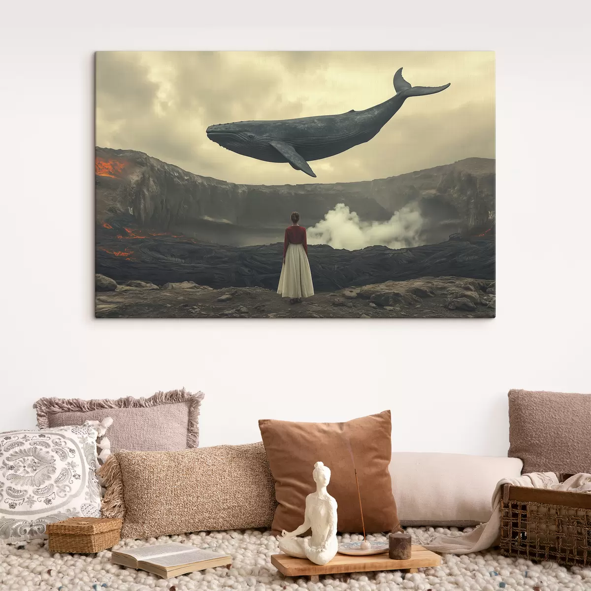 Schilderij Meisje op lava met een grote vliegende walvis in de lucht Art. s40986