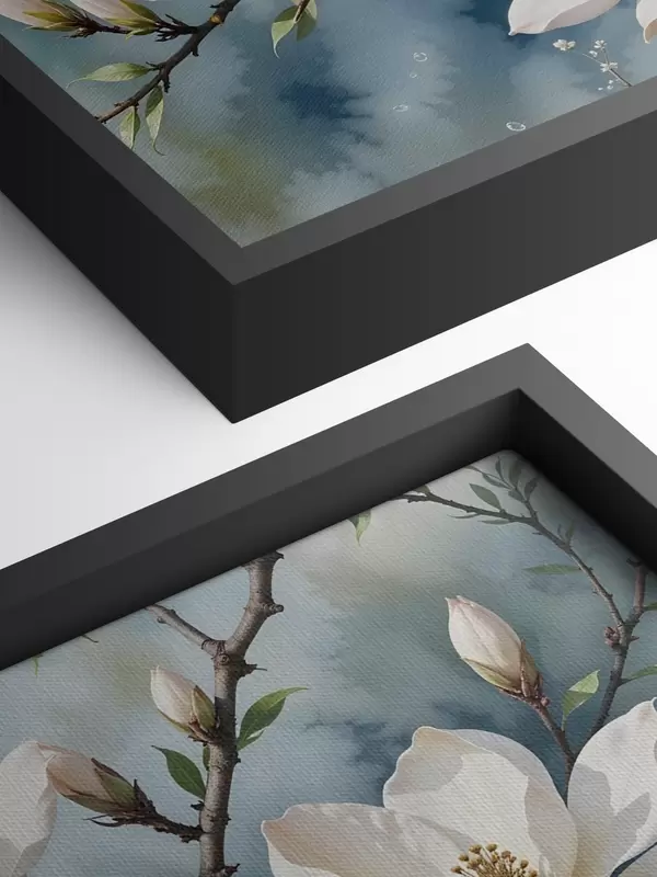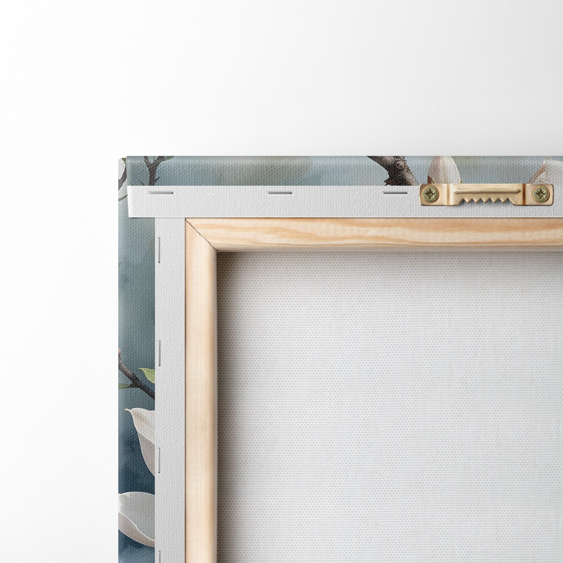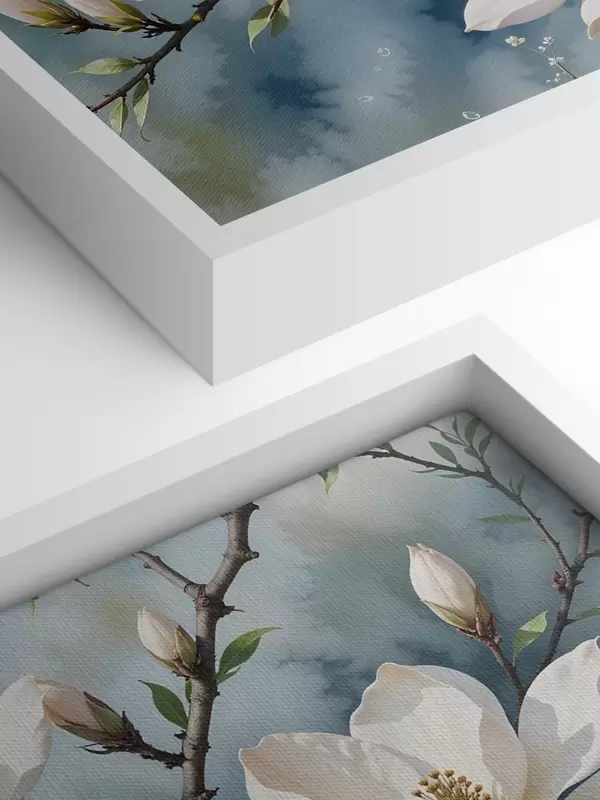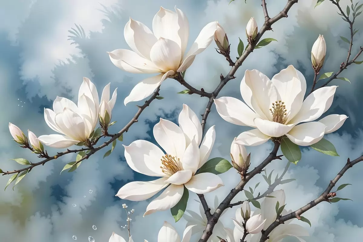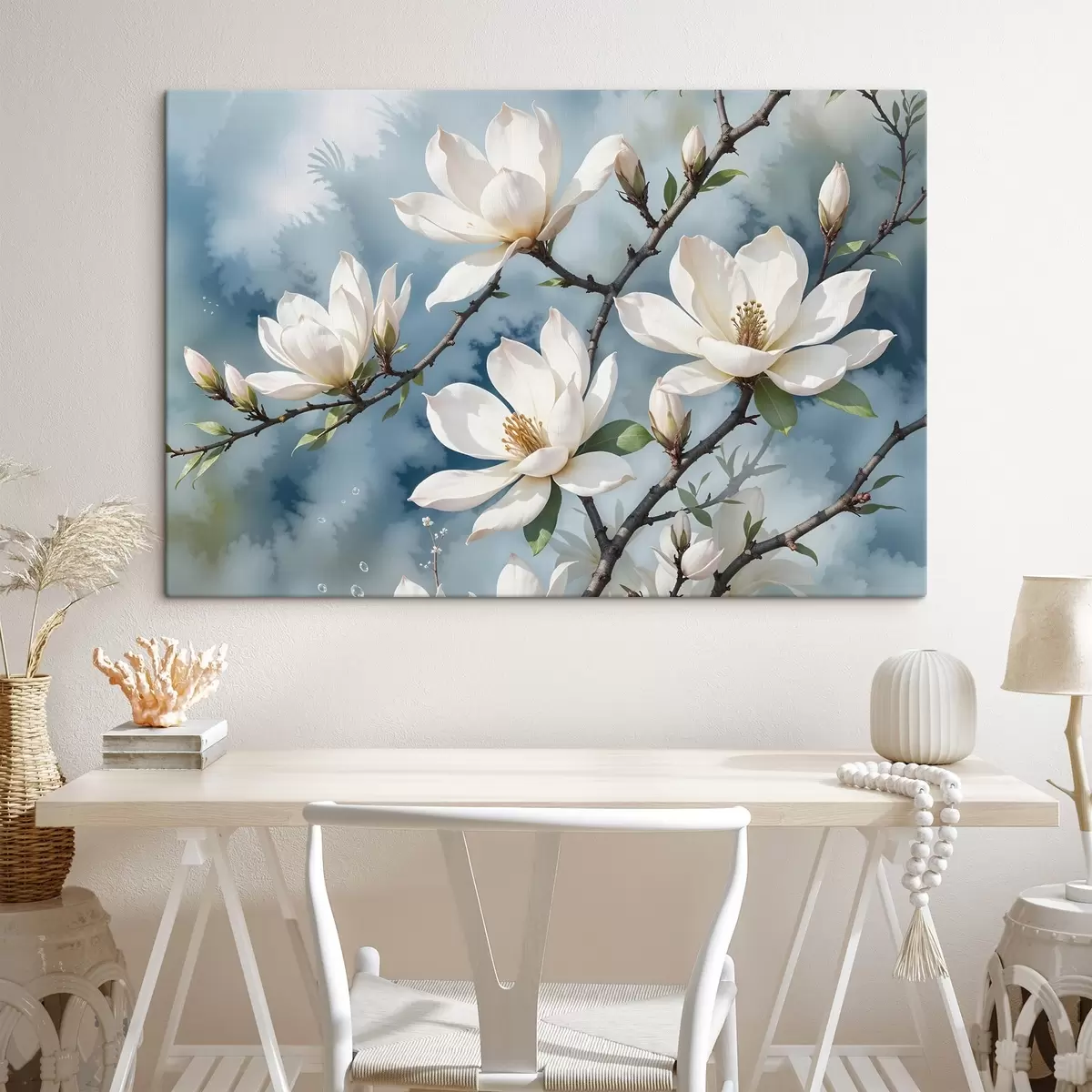 Schilderijen Witte magnolia bloemen bloeiend op boomtakken tegen een zachte aquarel blauwe lucht achtergrond s41081