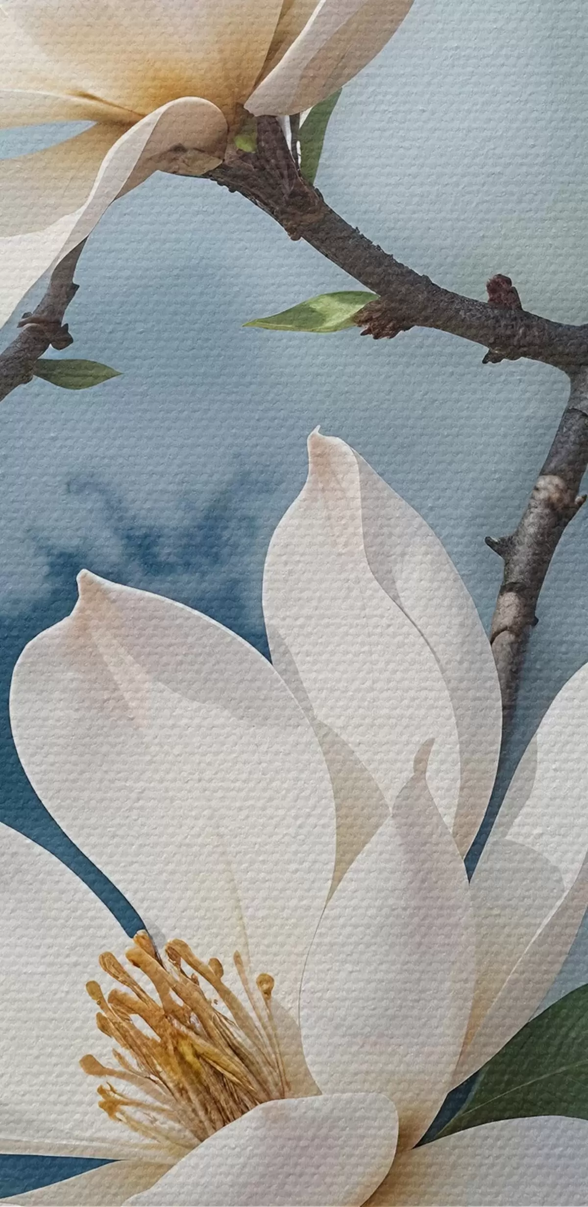 Schilderij Witte magnolia bloemen bloeiend op boomtakken tegen een zachte aquarel blauwe lucht achtergrond Art. s41081