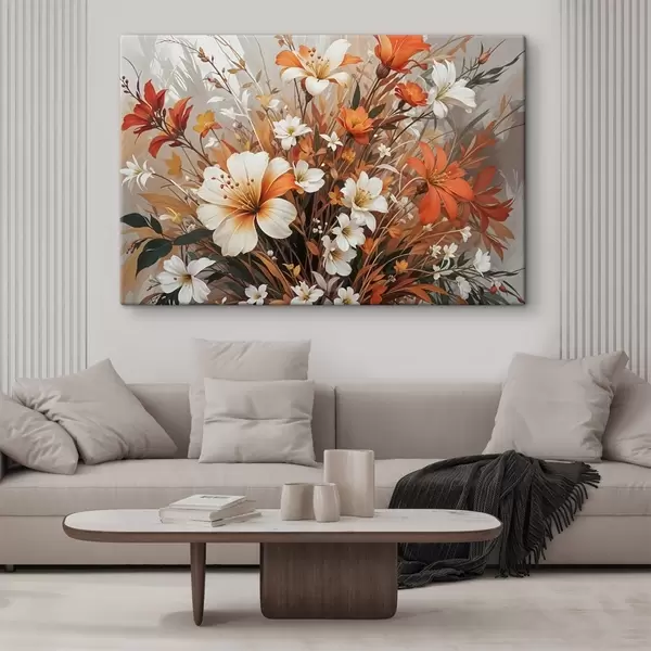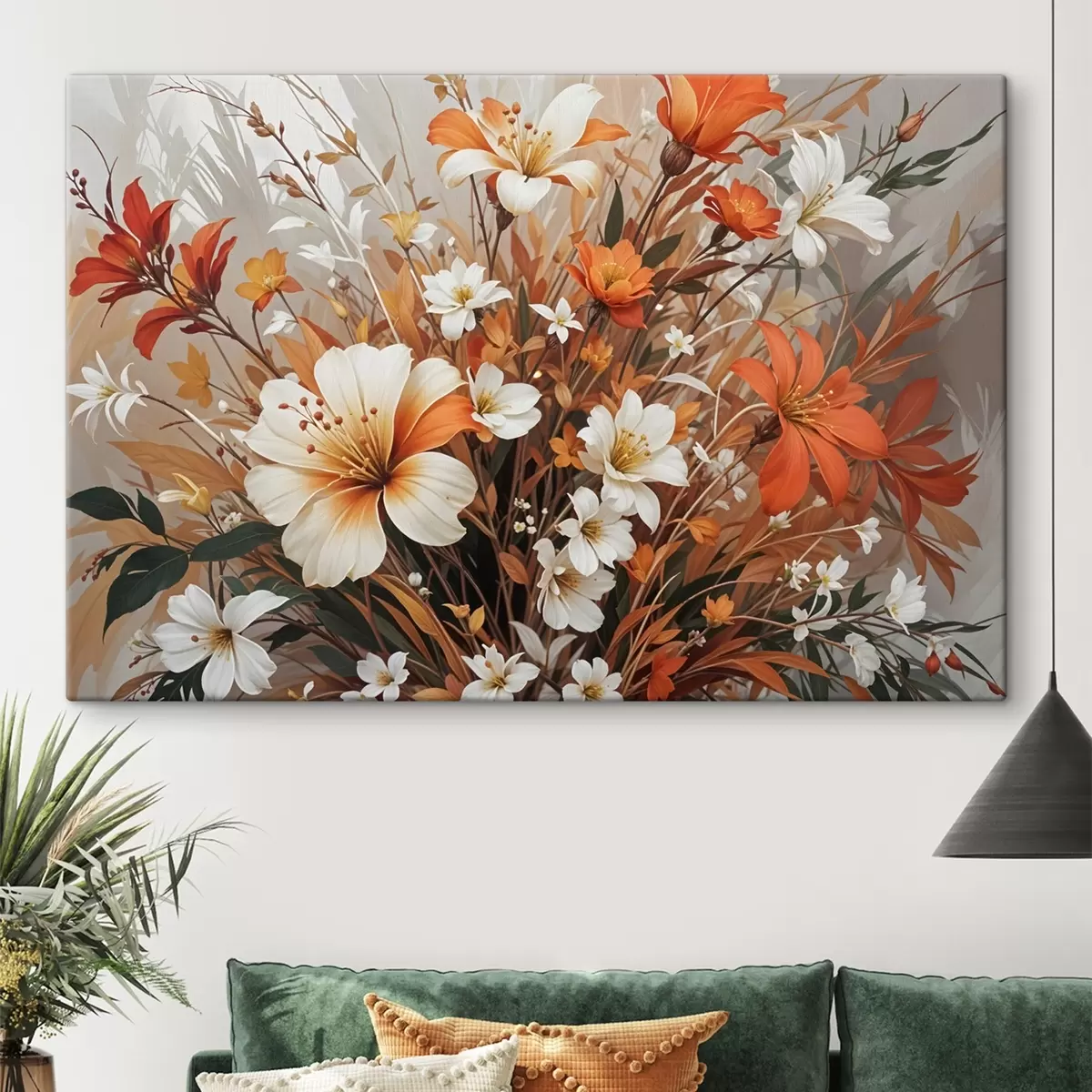 Schilderij Een levendig boeket van oranje en witte bloemen, inclusief lelies en andere delicate bloemen Art. s41099