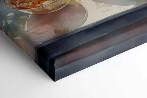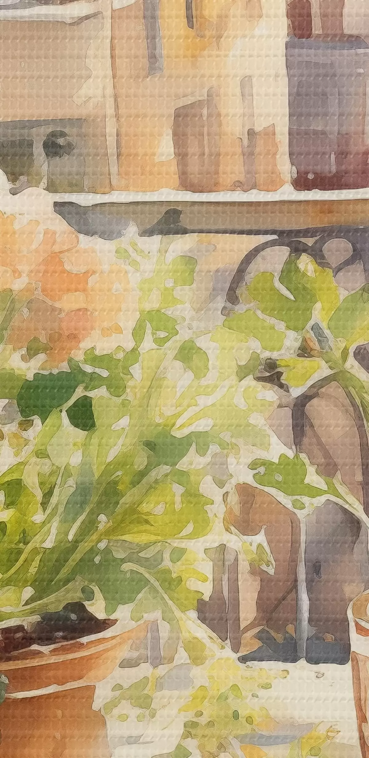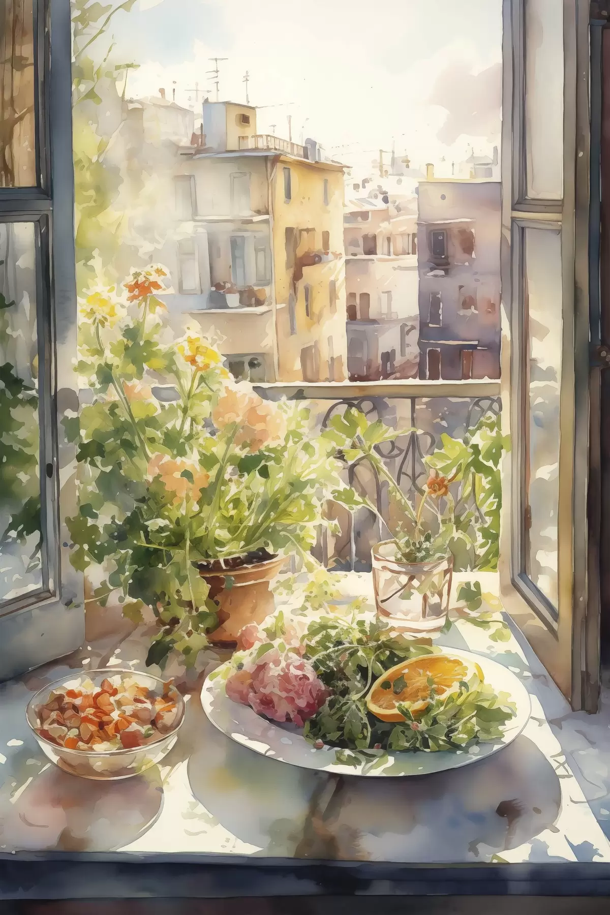 Schilderij Aquarel diner, stadsgezicht, bloemen, natuur, groene salade Art. s41166