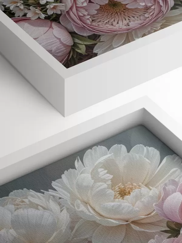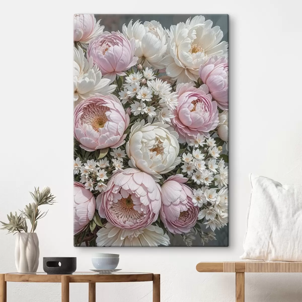 Schilderij Een boeket van pastelroze pioenrozen en witte margrieten, gerangschikt in een prachtige bloemencompositie Art. s41255