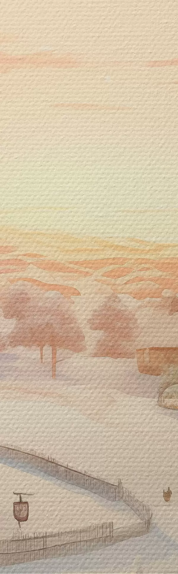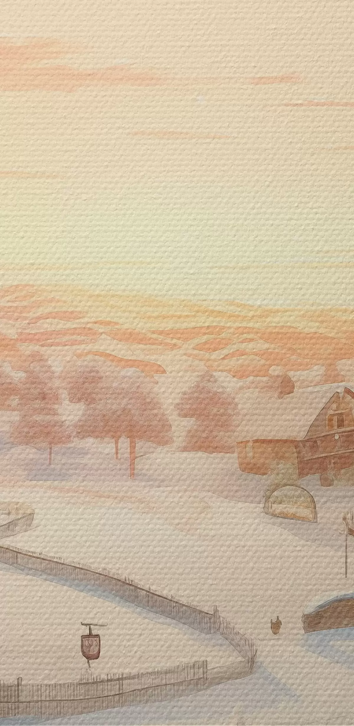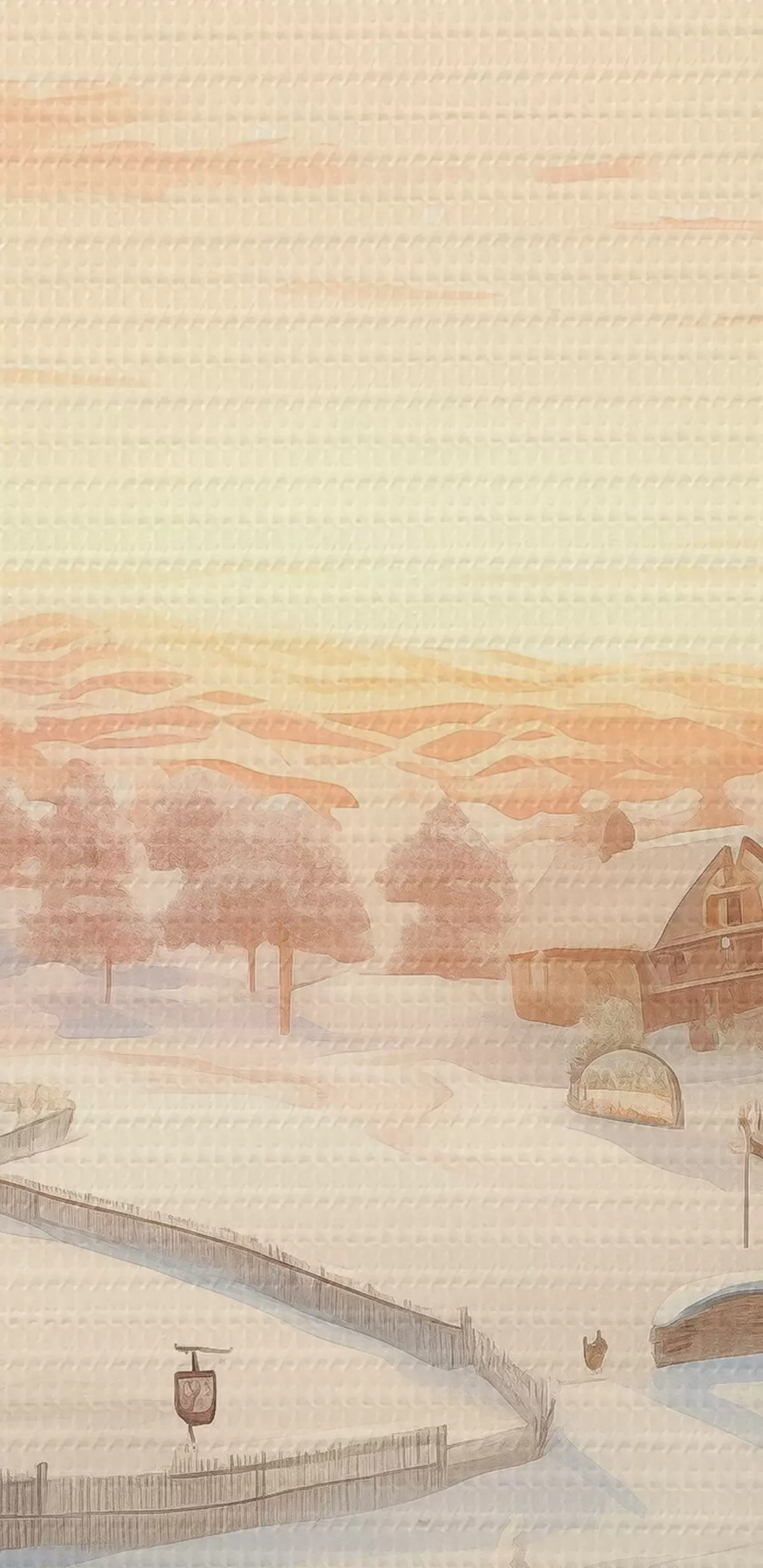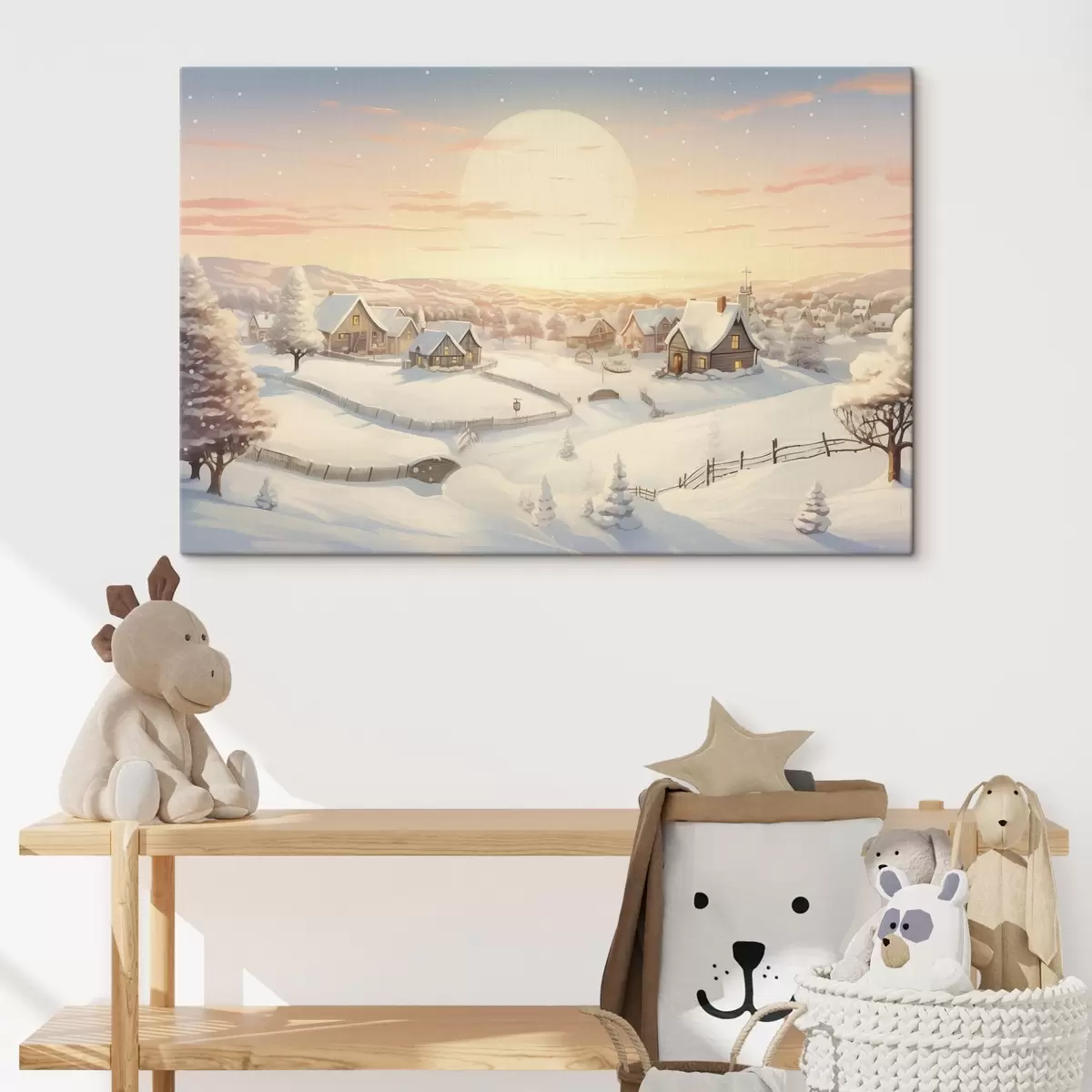 Schilderijen Winterdorp in de zonsondergang, huizen bedekt met sneeuw, dennenbomen s41380