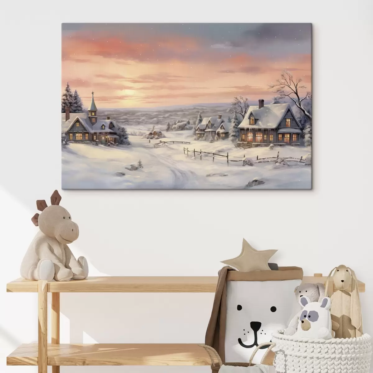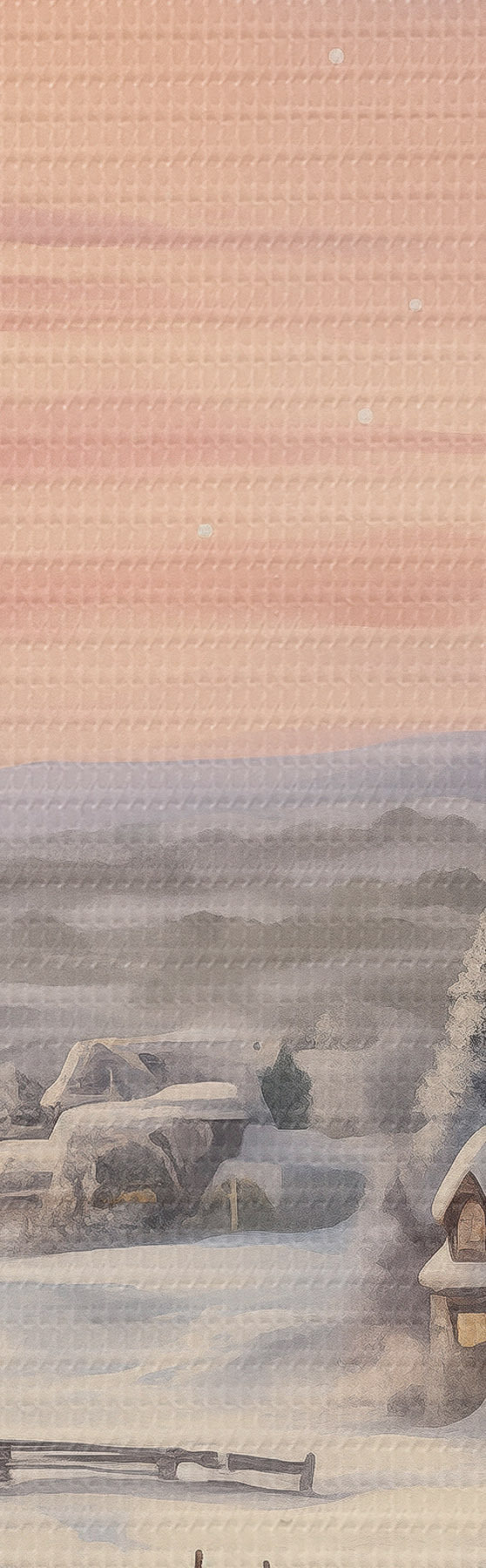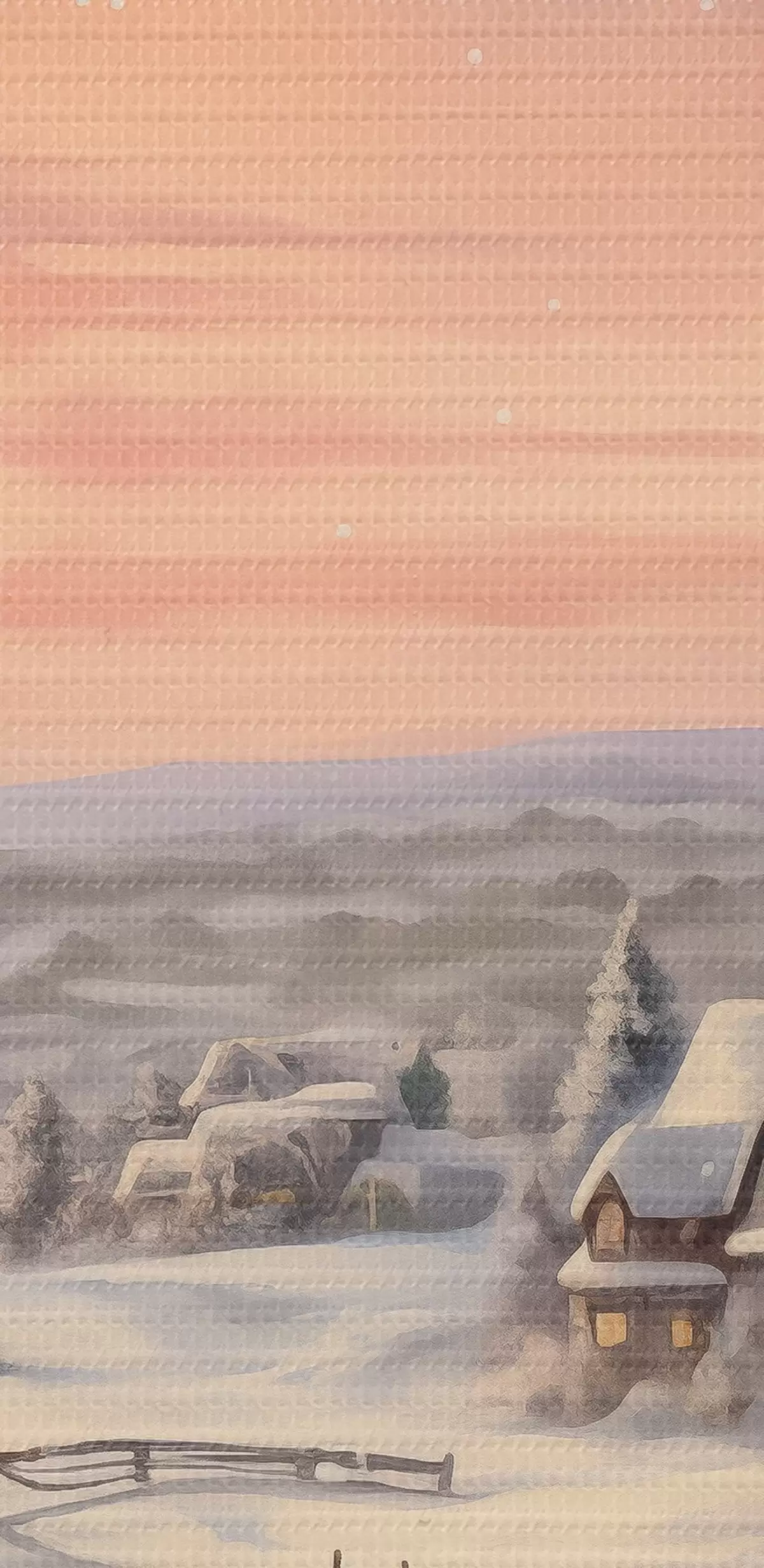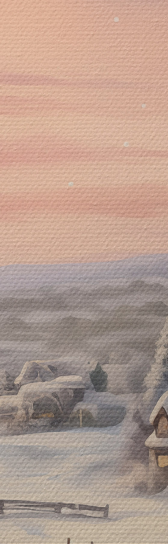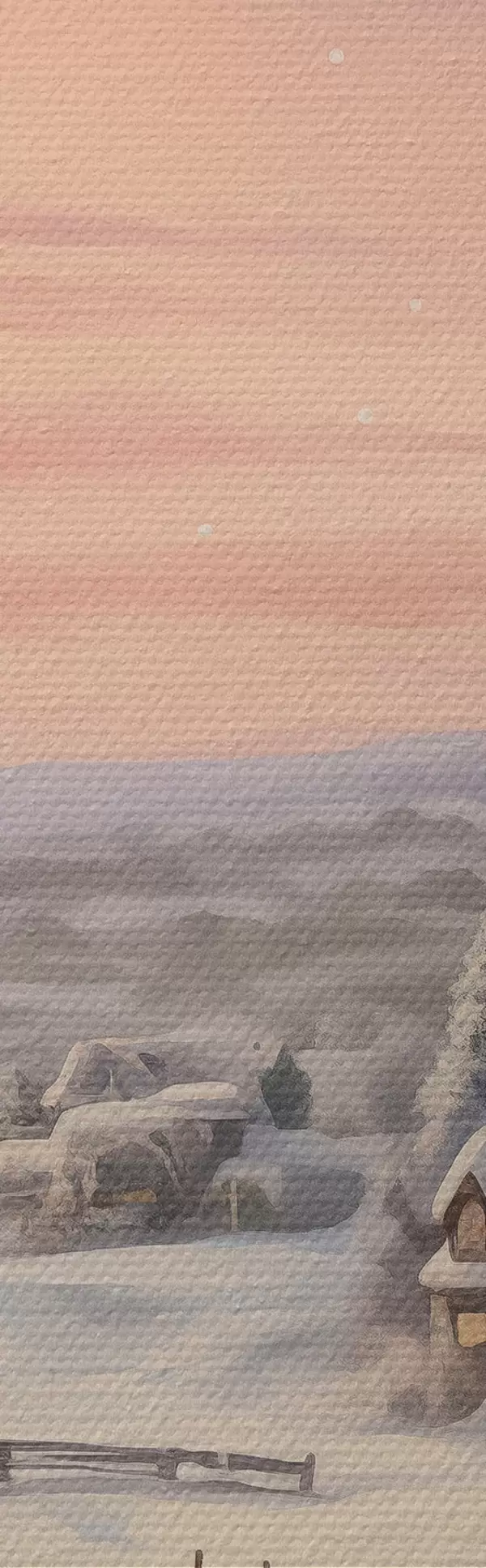 Schilderijen Zonsondergang in het winterdorp, rustiek, aquarel, sneeuwvlokken s41386